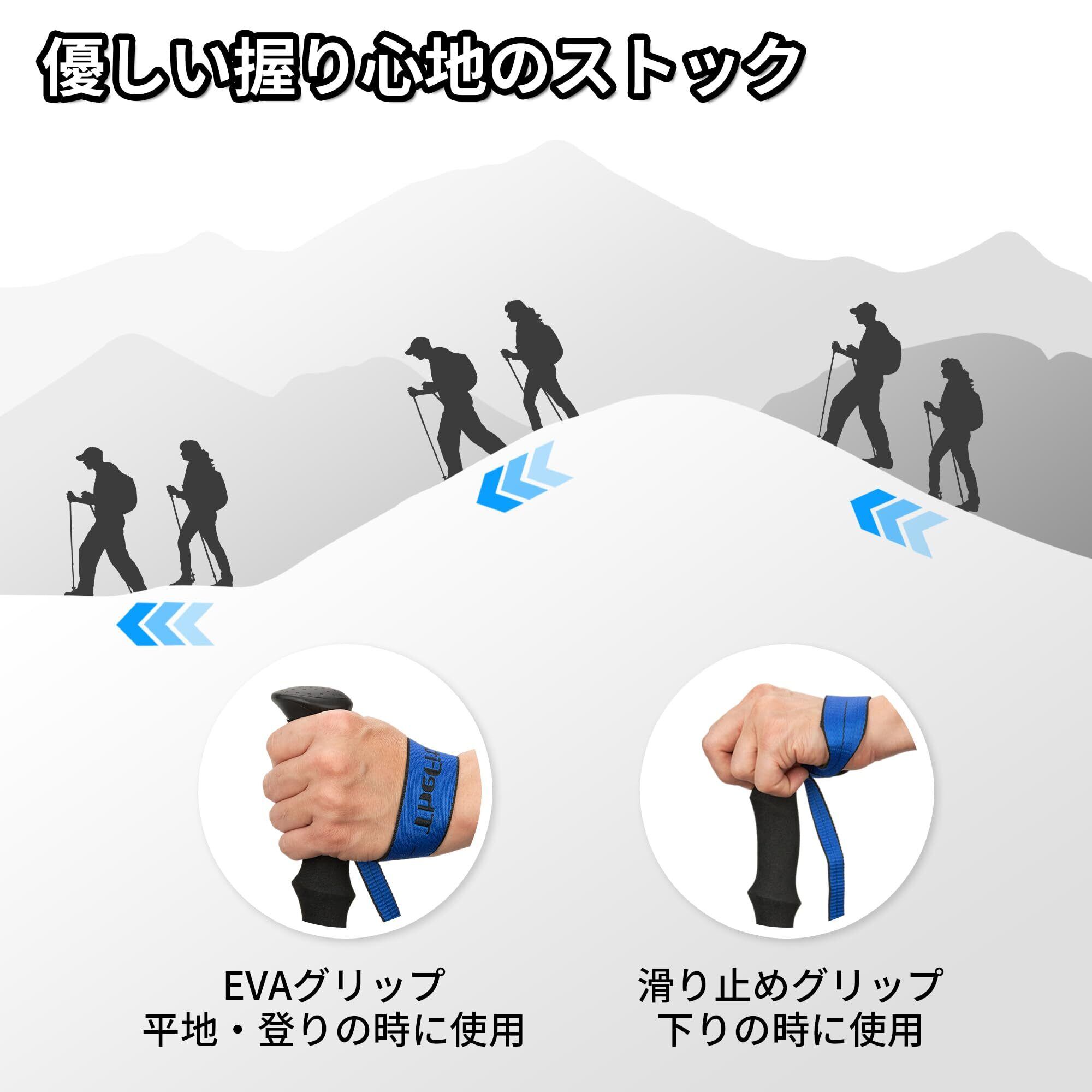 【快適なグリップ感】人間工学に基づいたEVAグリップは手のひらにフィットして使いやすさ抜群!どんな地形においても滑り止めの仕様で手汗を吸収し、登山中に手を快適に保ちます。調節可能なストラップを使用することで、休憩時に両手を解放して、手のひらのストレスが軽減されます。