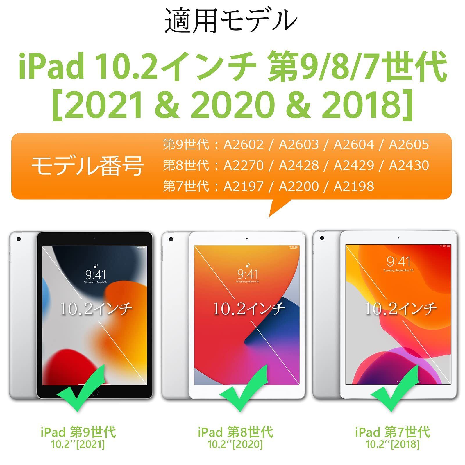 【対応機種】:本品はiPad第9世代/第8世代/第7世代10.2インチ専用デザインケースです。モデル番号:A2602/A2603/A2604/A2605(第9世代)、A2270 / A2428 / A2429 / A2430(第8世代)、A2197 / A2198 / A2200(第7世代)だけに適用されるため、ご購入前に必ずご確認ください。※ご注意:10.9インチのiPad 第10世代、9.7インチのiPad 第6/5世代に は適用されないためぜひご確認ください。