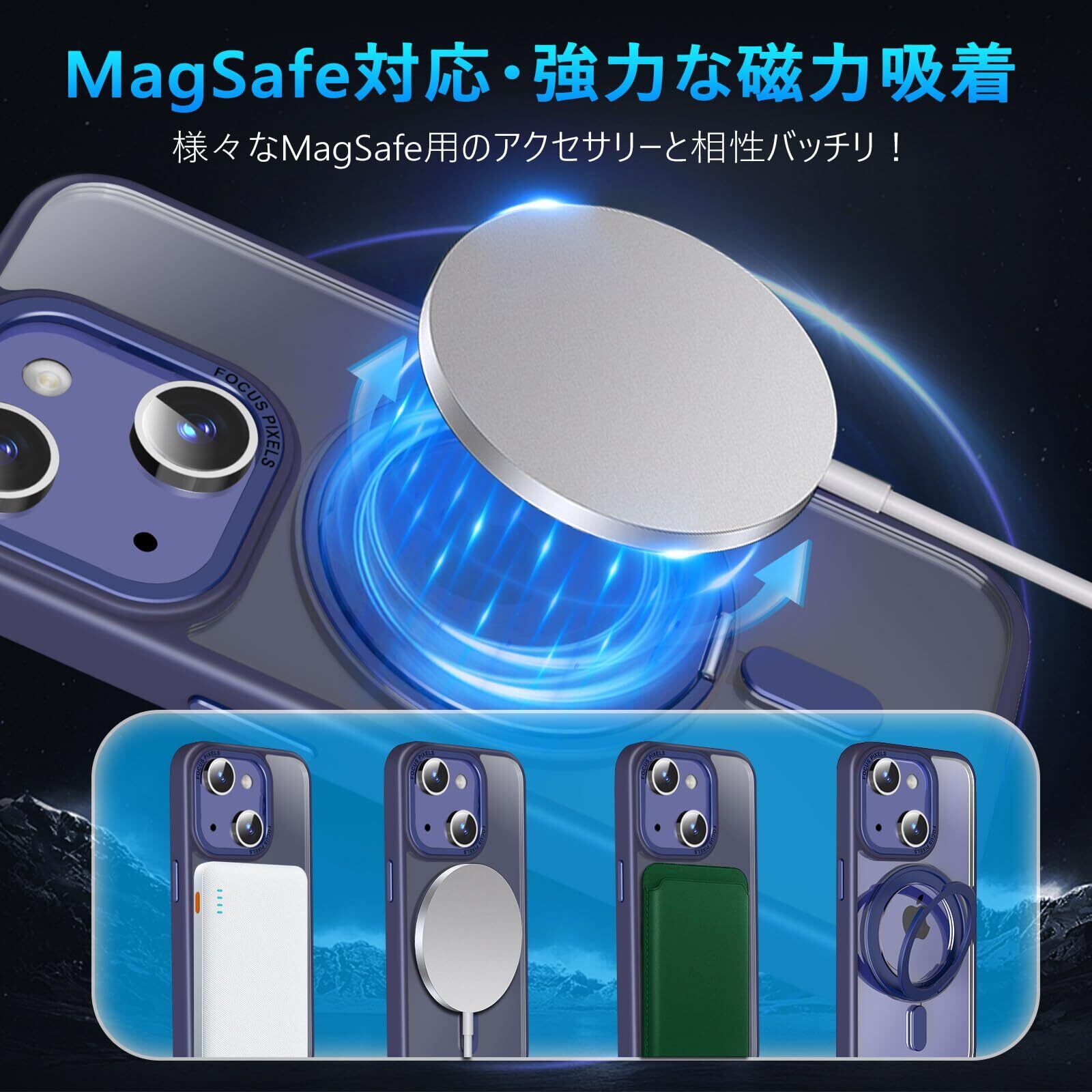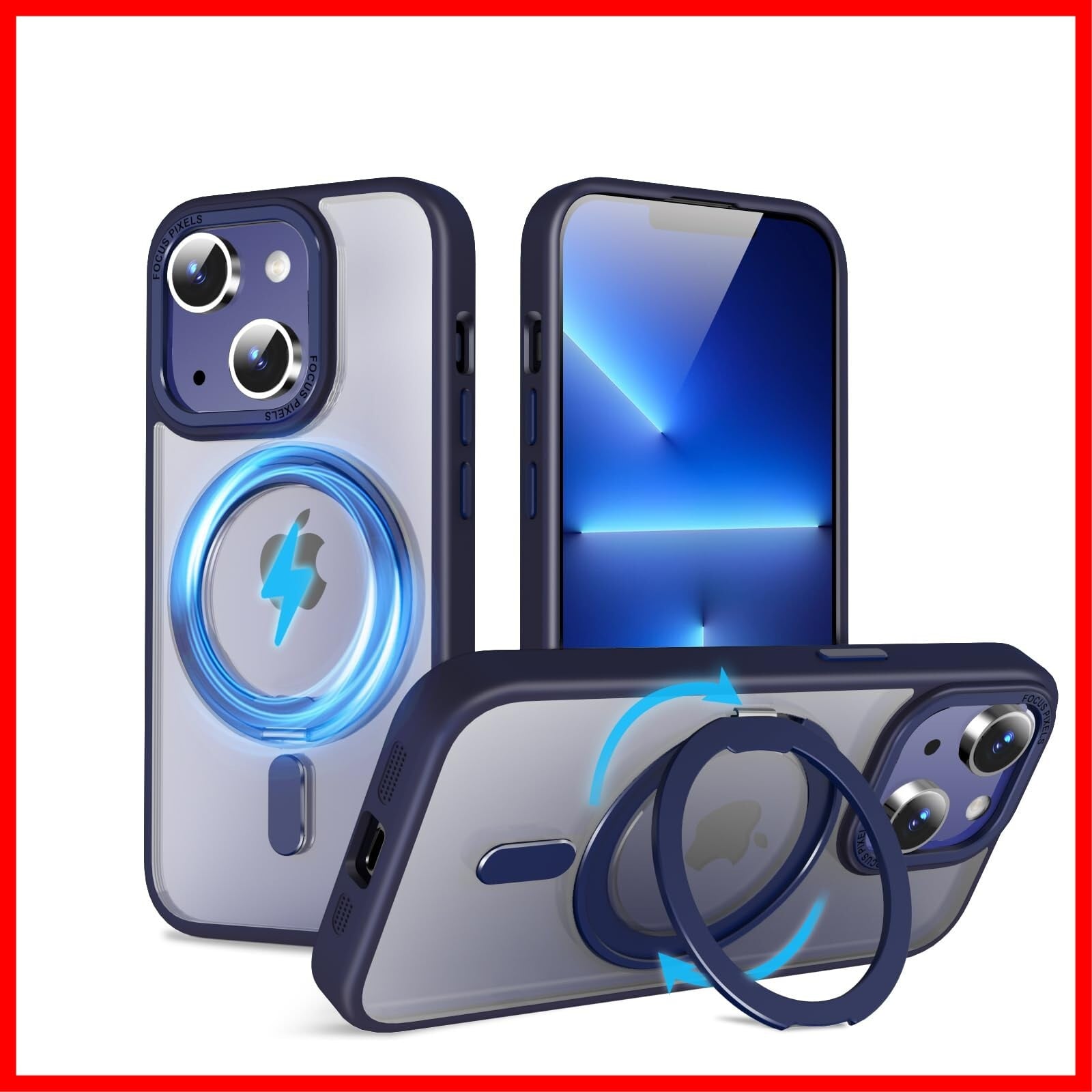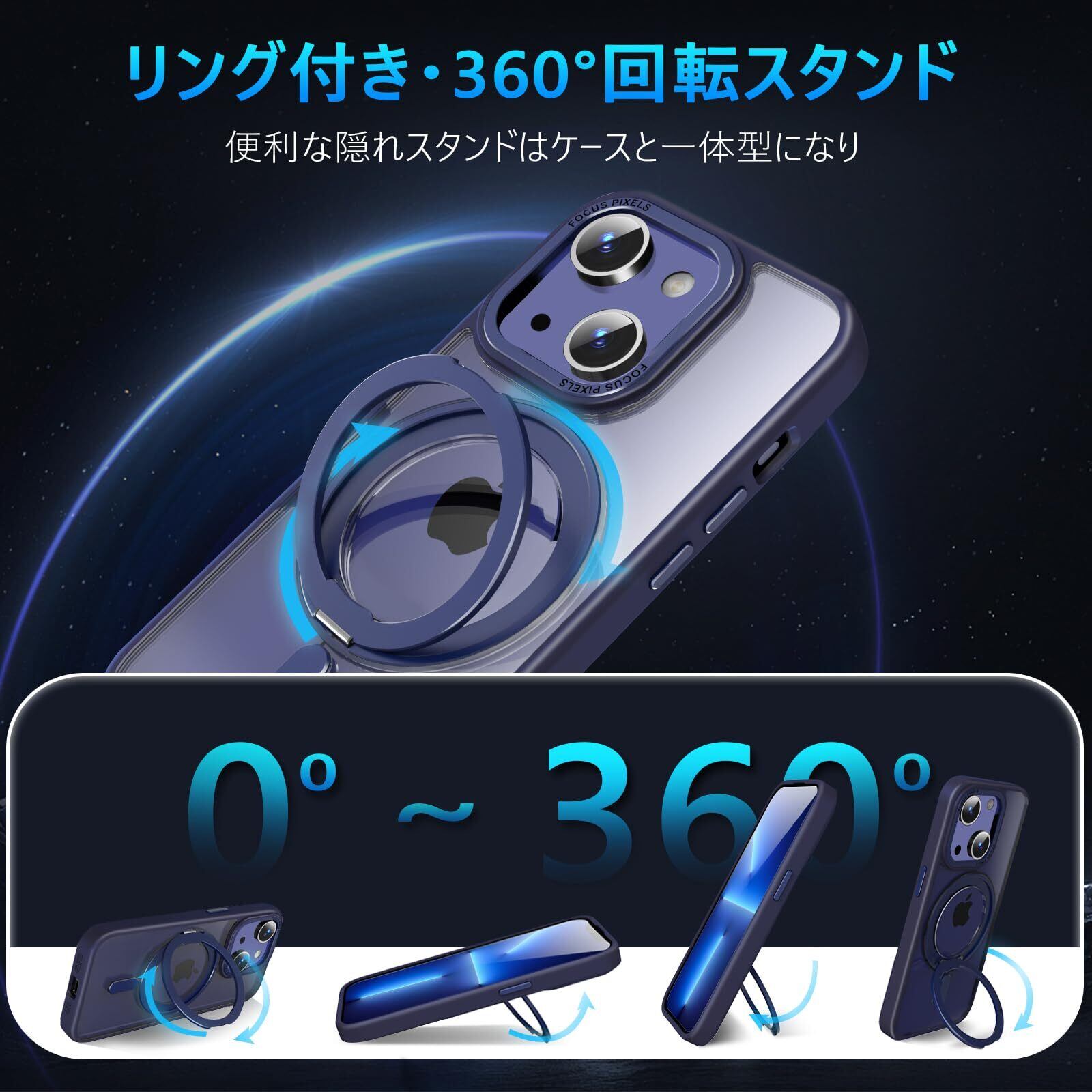 QUEASON【iPhone 13/14 通用ケース MagSafe対応】360°回転スタンド ワイヤレス充電対応 いphone14 ケース リング付き 米軍MIL規格 iphone13 カバー 超強磁力 落下防止 耐衝撃 アイフォン14 カバー 半透明 防指紋(ブルー)