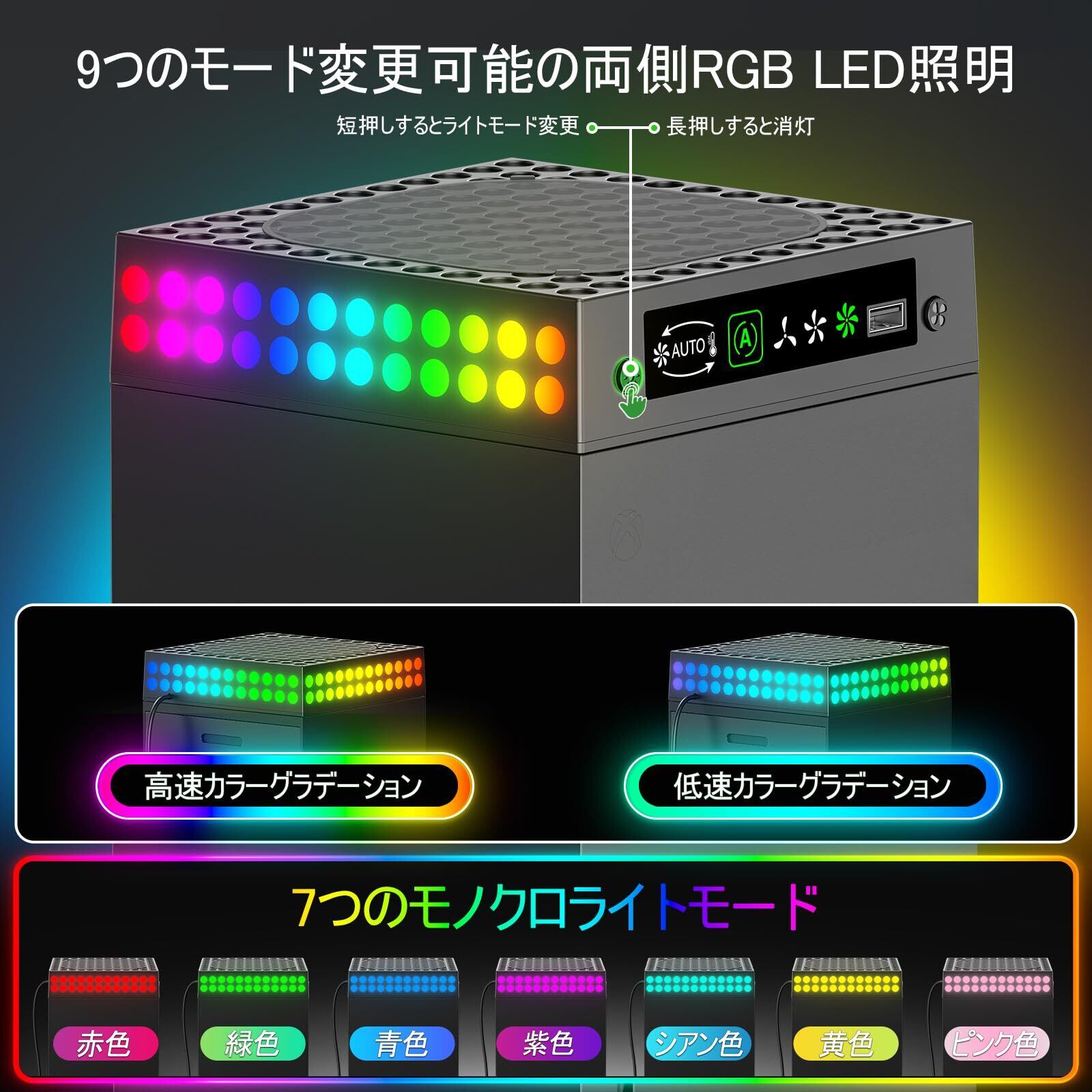 【モード変更可能の両側RGB LED照明】xbox series x アクセサリー両側を光るRGBライトは7種類のモノクロモードと2種類のグラデーションモードを調整できます。ファンが作動している間は、LEDがグラデーション発光し、ゲーム体験を一層豊かにしてくれます。