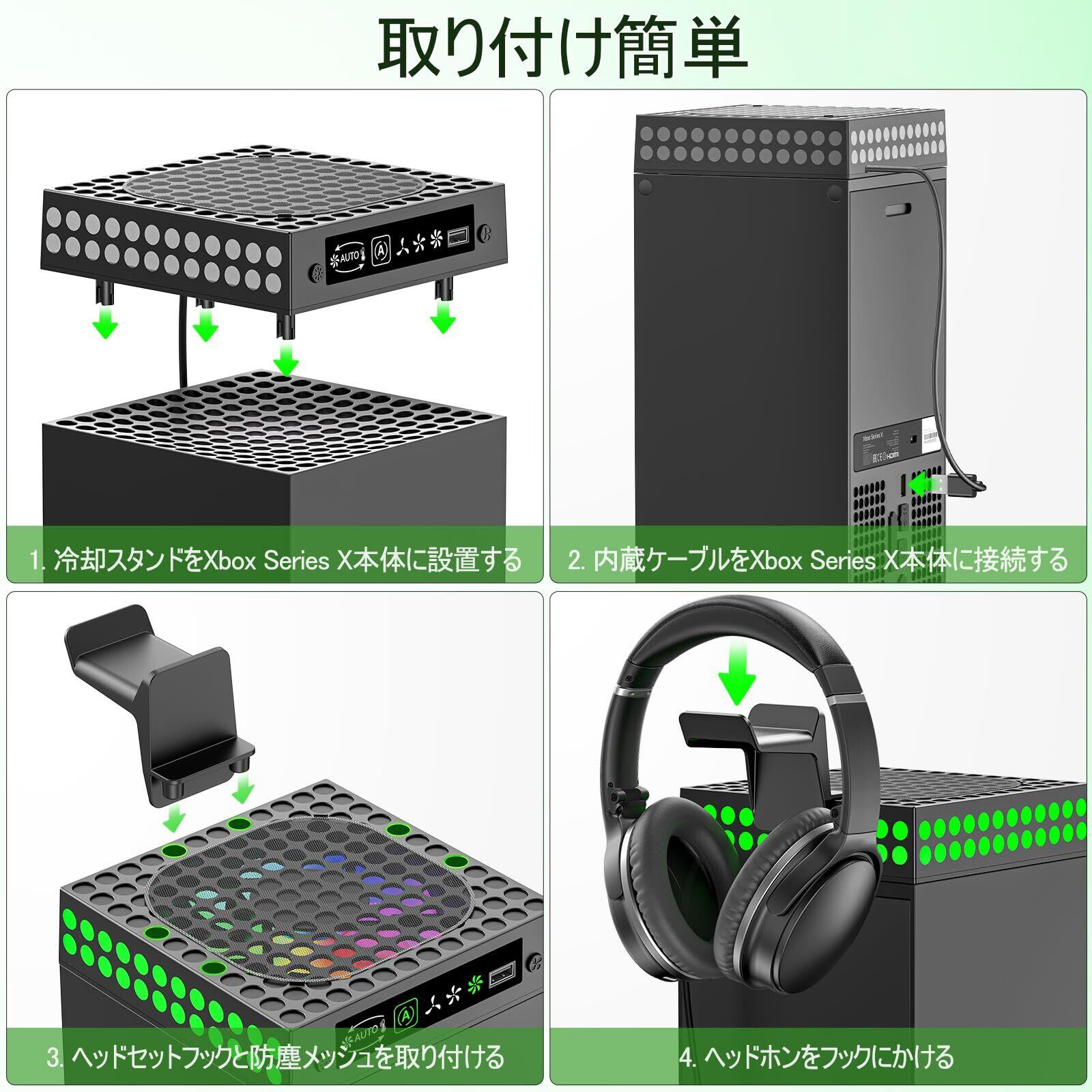 X-box Series X冷却ファン クーリングファン 低騒音 知的温度制御 手動/AUTOモード 3段階速度調整 取り付け簡単 熱対策 排熱 防塵 取り外し可能なヘッドセットフック付き RGB LED雰囲気ライト付 XboxシリーズX コンソール用アクセサリー Xbox Series Xに対応 周辺機器