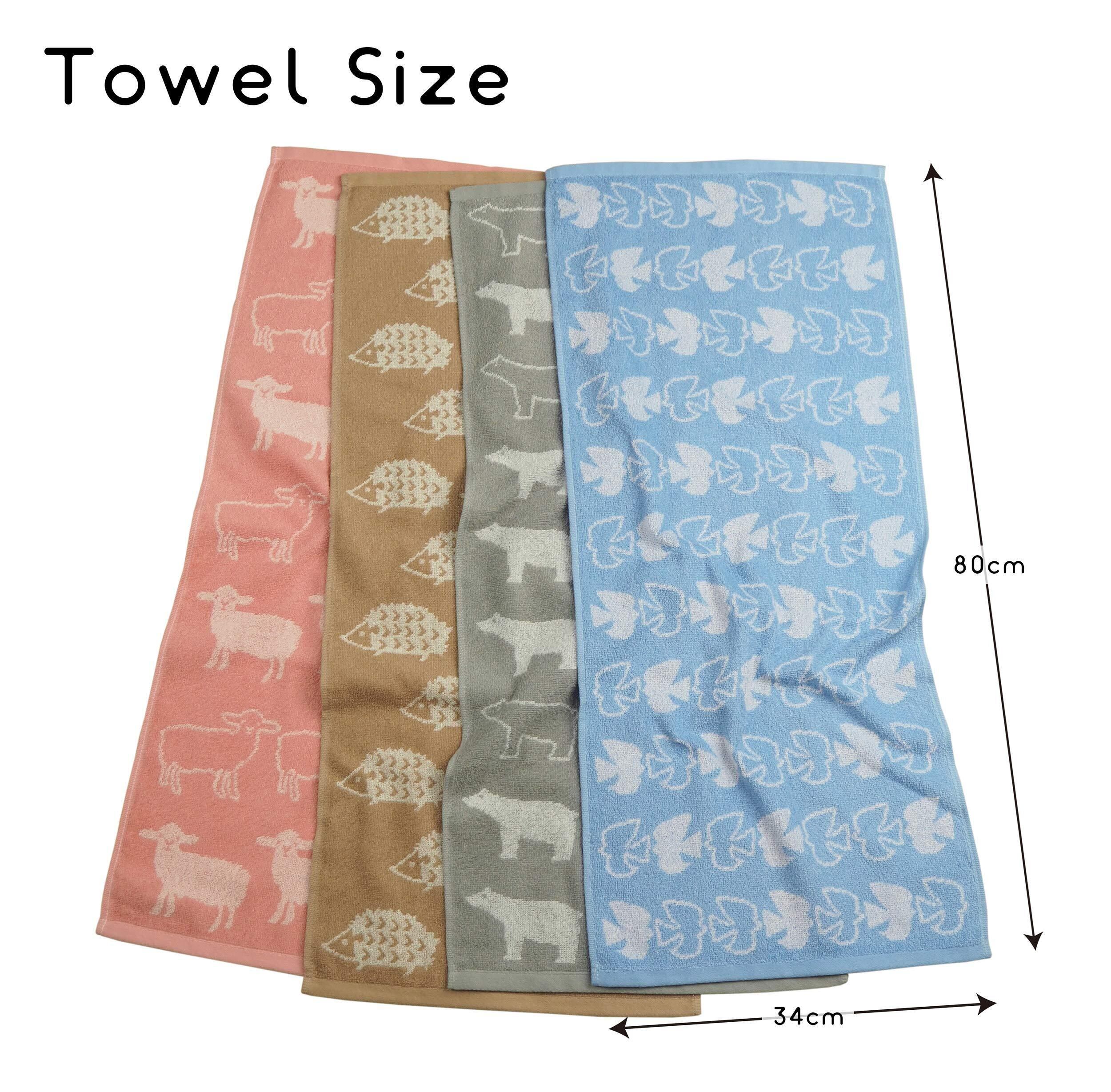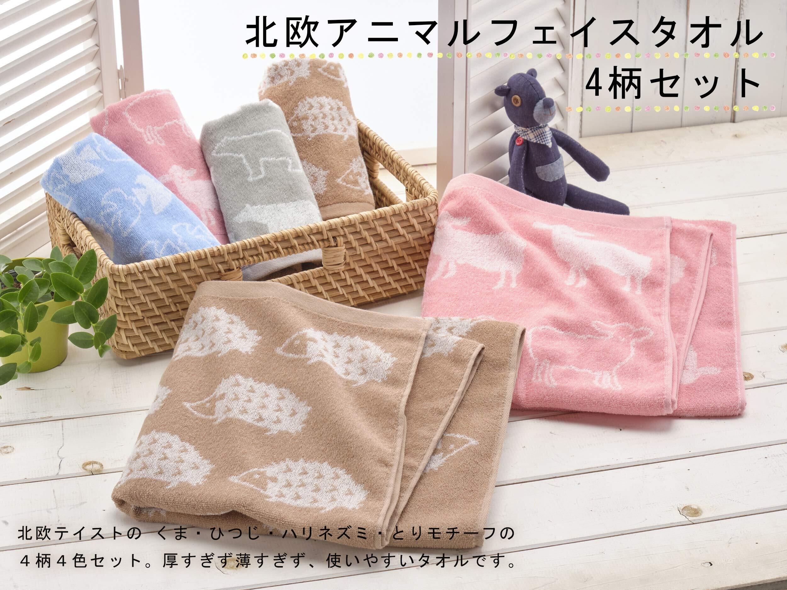 Kosugizen フェイスタオル 北欧アニマル 4色(4柄)各1枚入 34×80㎝ 北欧調のアニマルモチーフ ほどよいボリューム感 4枚セット SV-263-4