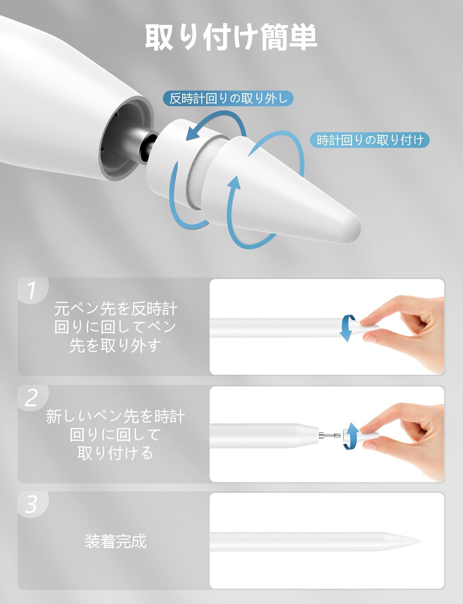 【ワンステップ交換設計】Apple Pencilのペン先を反時計回りに回してペン先を取り外します。チップをApple Pencilの本体に時計回りに回して取り付けます。 入り数:Apple Pencil/Apple Pencil2の交換用チップ4個 ご注意: Apple Pencilは含まれていません。