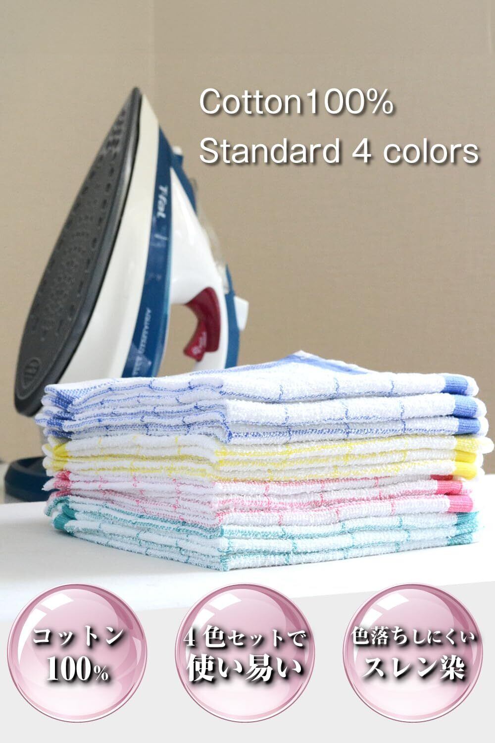 【繰り返しの洗浄に適した抜群の耐久力】スレン染めなので何回洗っても色落ちがしづらく、薄手なので収納もコンパクトな万能キッチンタオル