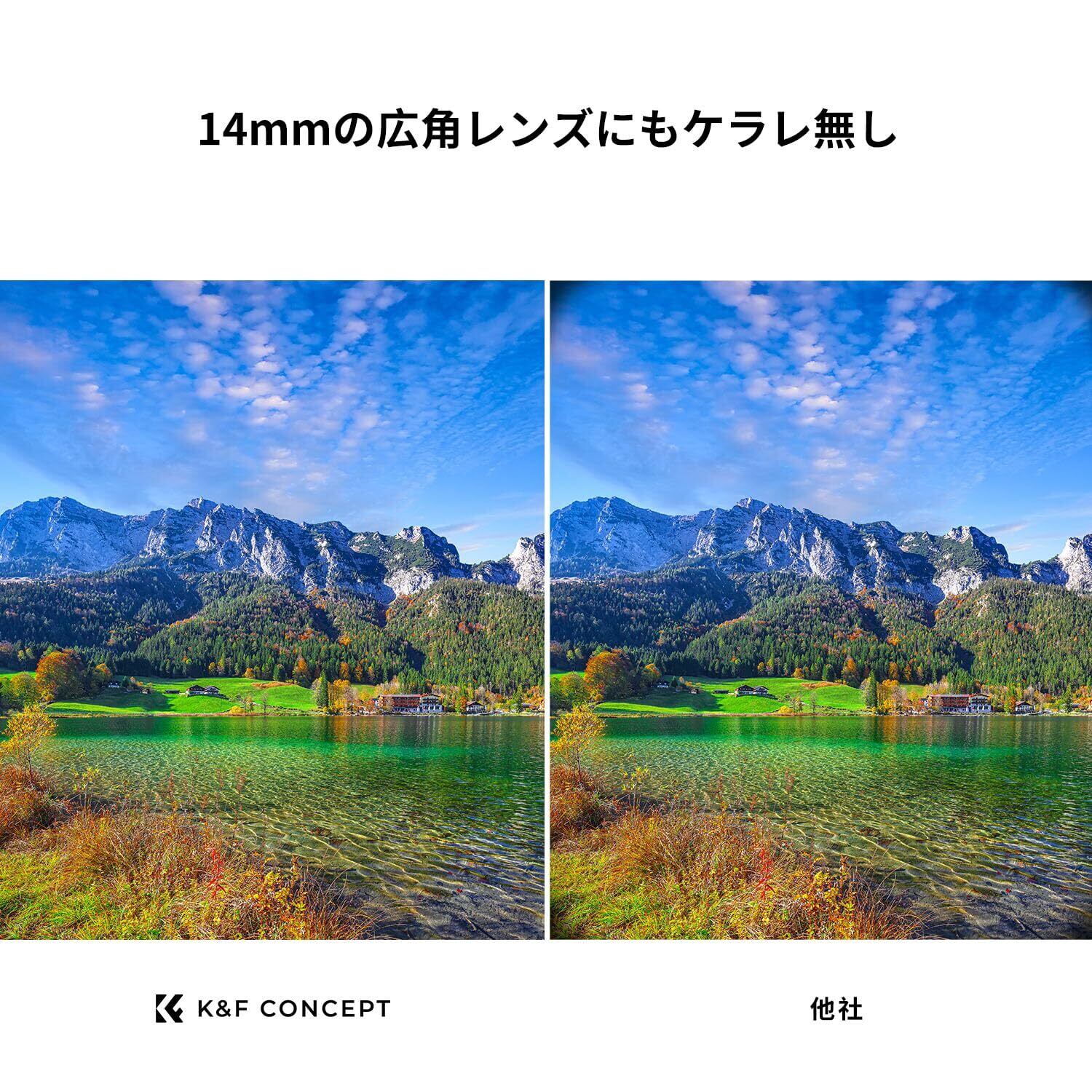 【薄枠設計】精密加工ノアルミニウムによる薄枠設計が採用されているので、広角端でもケラレが発生しません。(※️本レンズ保護フィルターは望遠レンズの使用には適していません。)