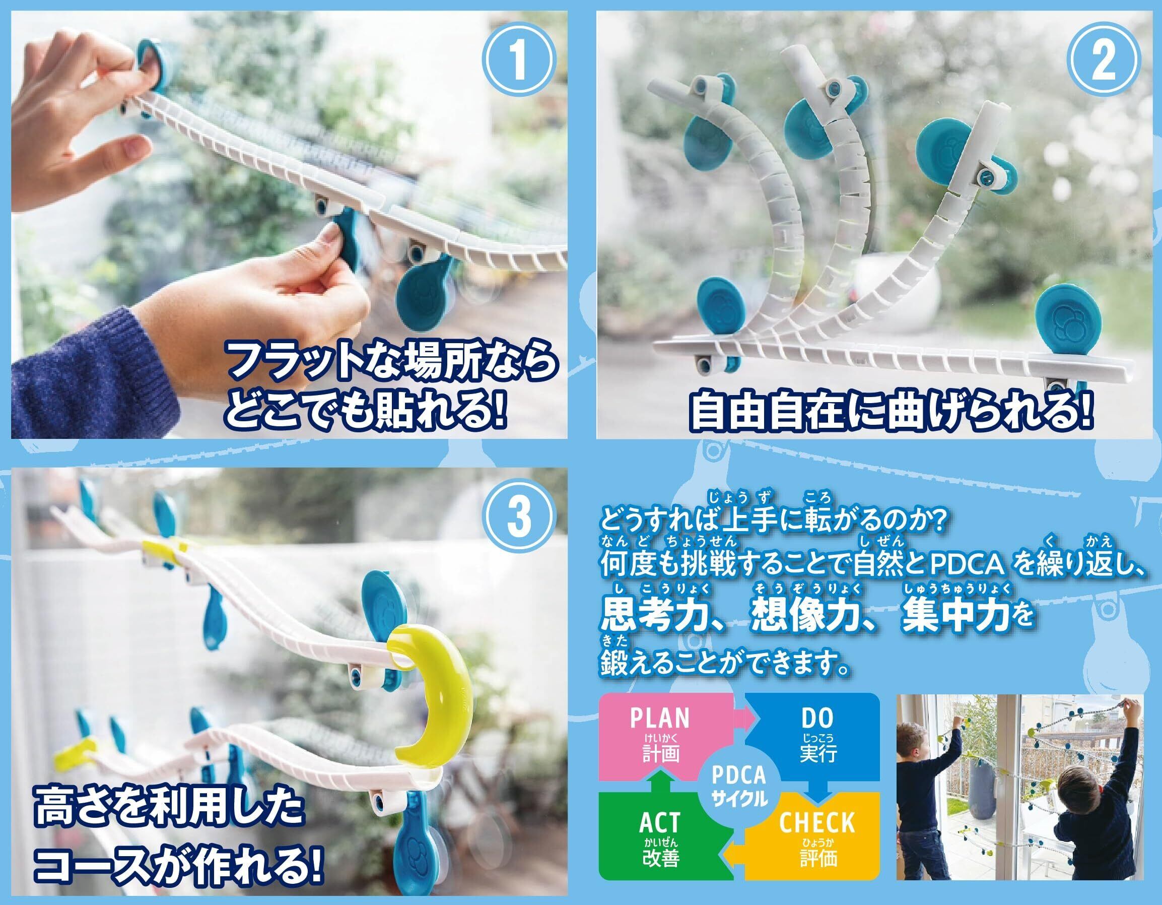 壁や窓に貼り付けて、高さのあるスライダーが簡単に楽しめる「絶壁スライダー」、床に場所が無くても、窓やドアなどのフラットな壁面があればどこにでも作れます! 遊びながら、重力や動力、遠心力などの原理を体感することができます。