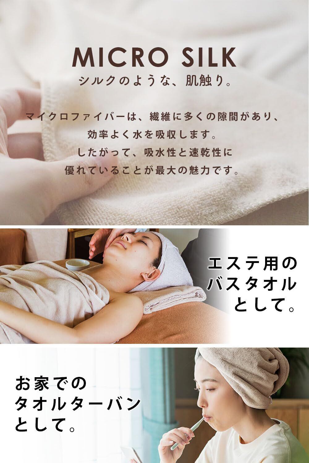 【 心地の良い肌触り 】 ■ マイクロファイバーは、綿とは異なる特性を持っています。繊維内に三角形の形状があるため水を効果的に吸収できます。さらに、マイクロファイバーはふわふわとした肌触りがあり、弾力性もあります。触れると心地よく、柔らかな感触があります。