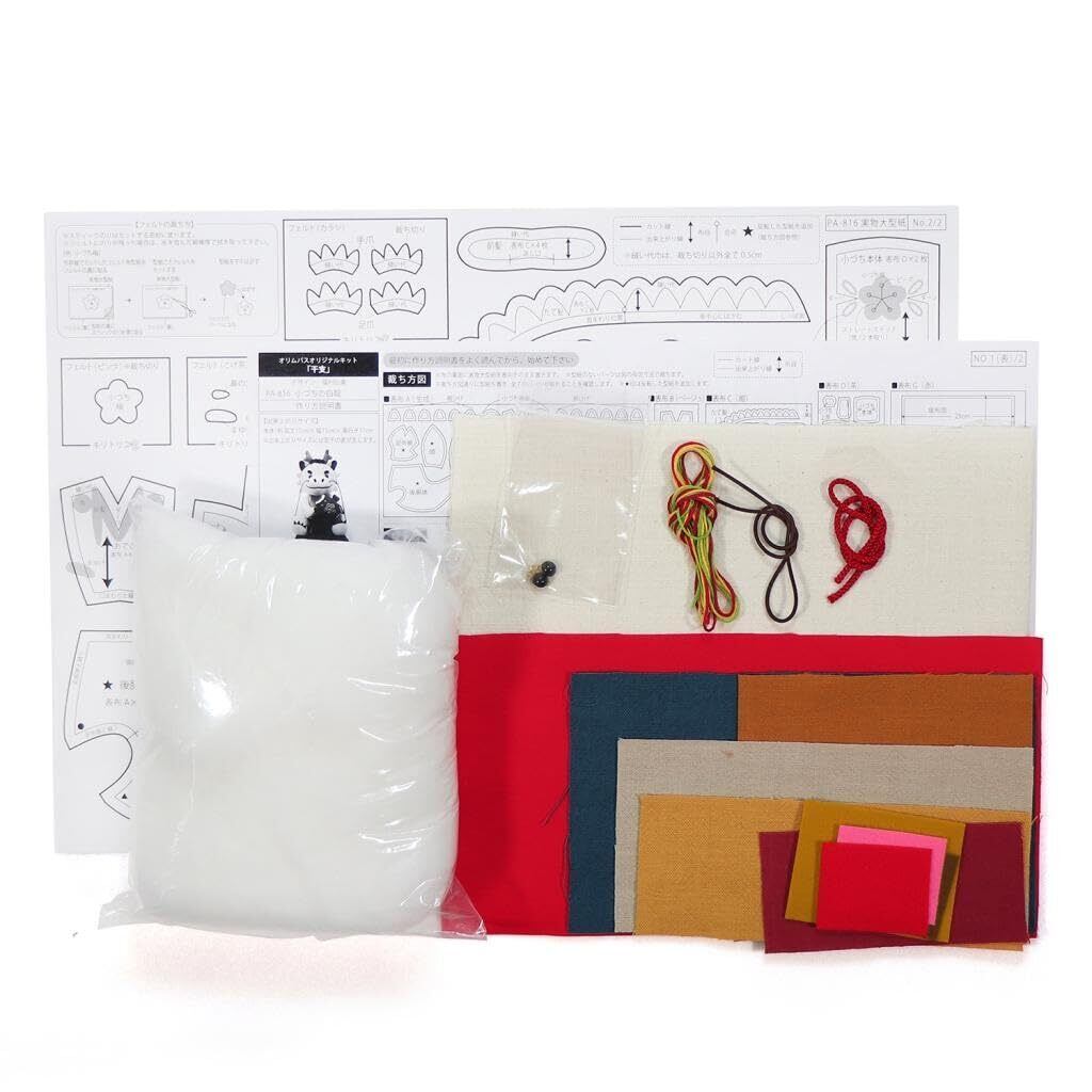 キット内容:布、フェルト、詰め綿、目玉ボタン、ビーズ、紐、ゴム、刺しゅう糸、作り方説明書、実物大型紙