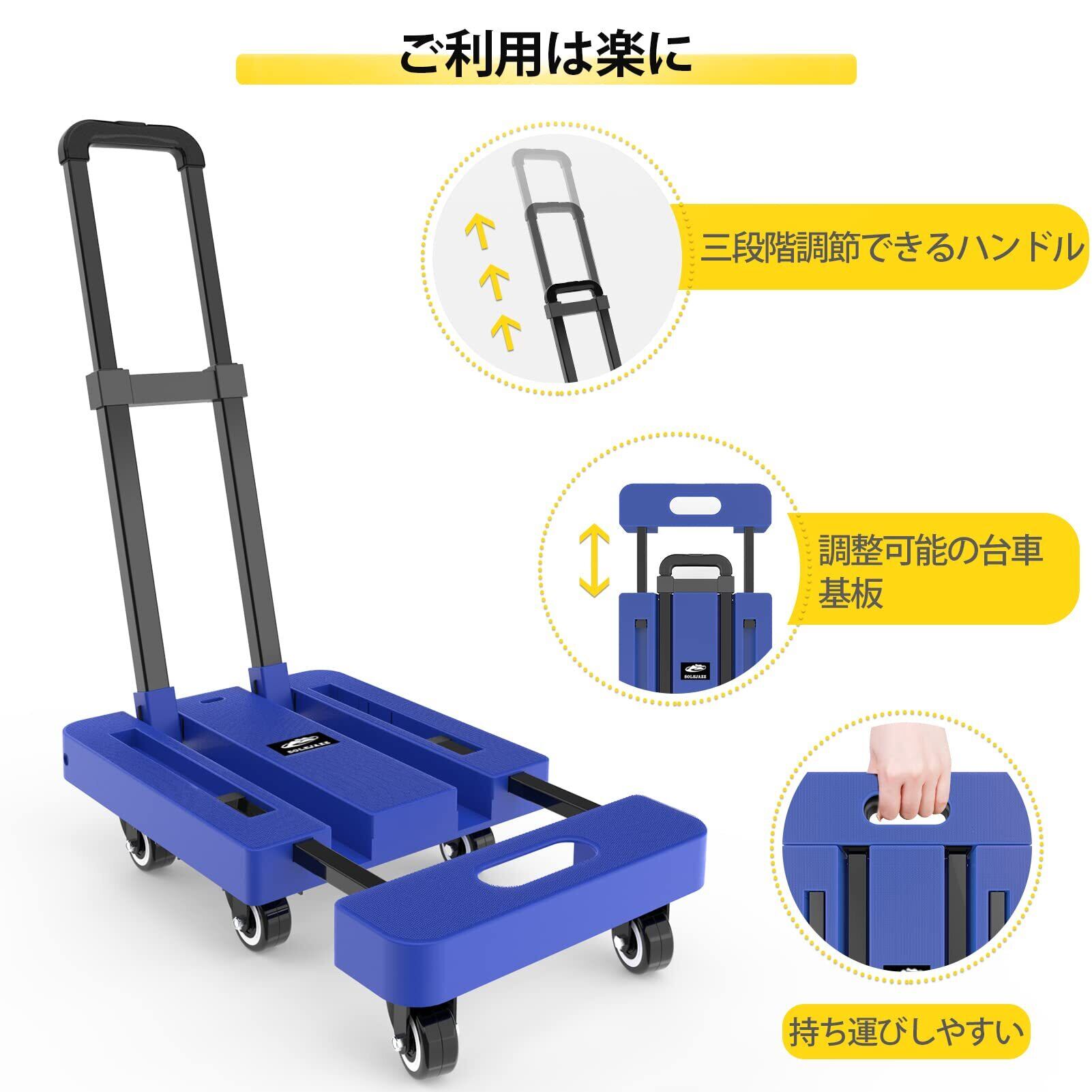 【頑丈な素材】この台車は、特製プラスチック荷台、厚くステンレススチールハンドルと六つのゴム製キャスターがあり、最大耐荷重も266KGぐらいに達しています。安定性のために、荷物を荷台の中央に置いてください。不平な地面で使えば、移動のスピードも注意ください。