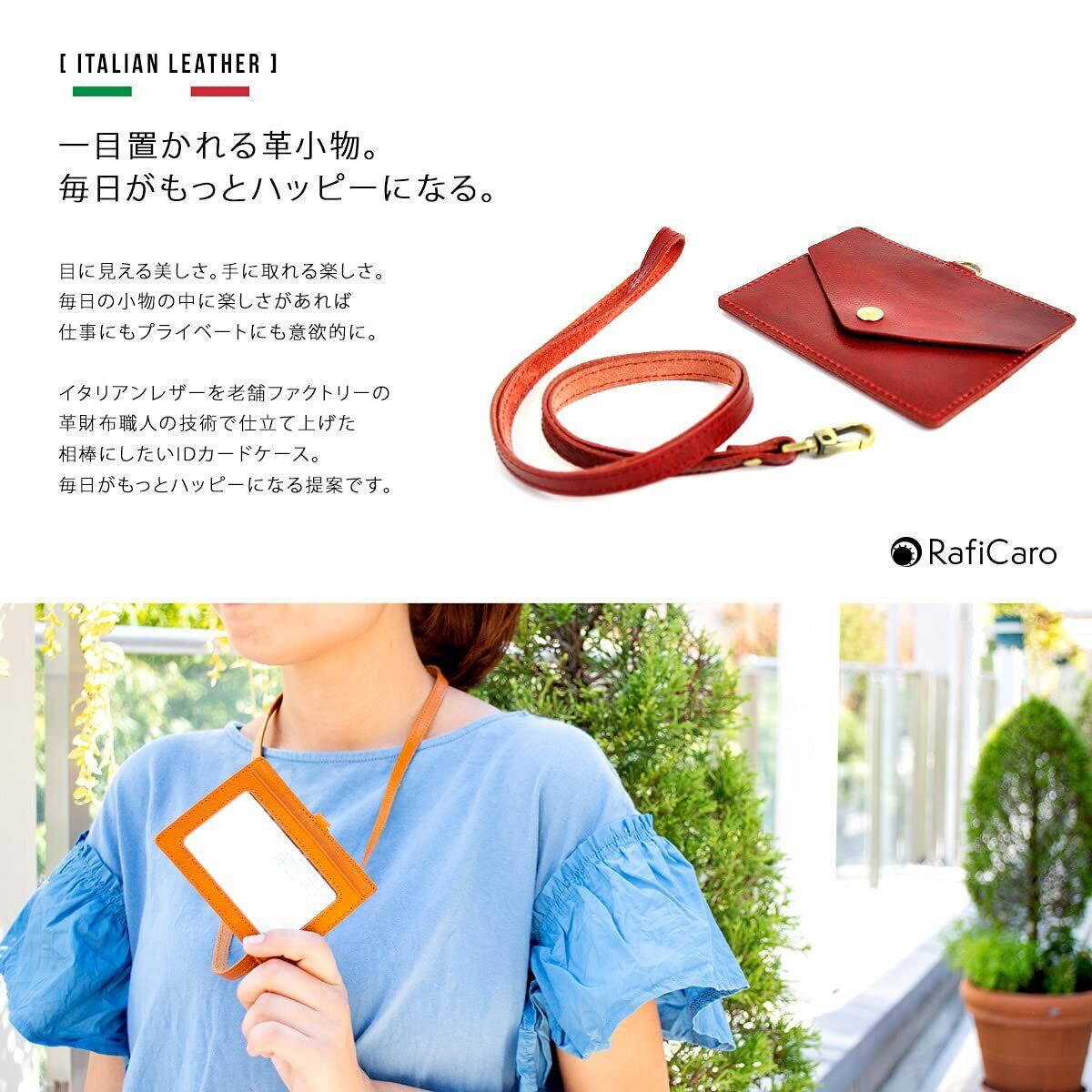 [ブランド] RafiCaro - ラフィカロ 【身につけるこだわり】毎日がもっとハッピーになる。 ポイントは裏面のポケット 可愛い封筒のようなボタン留めのポケットになっています。 カードだけでなく、大事なメモやお金をそっと入れておいてもOK 素材も使用するにつれてエイジングがかかり味わいが深くなるイタリアンレザーを使用。 末永く使えるパートナーとして最良の素材です。