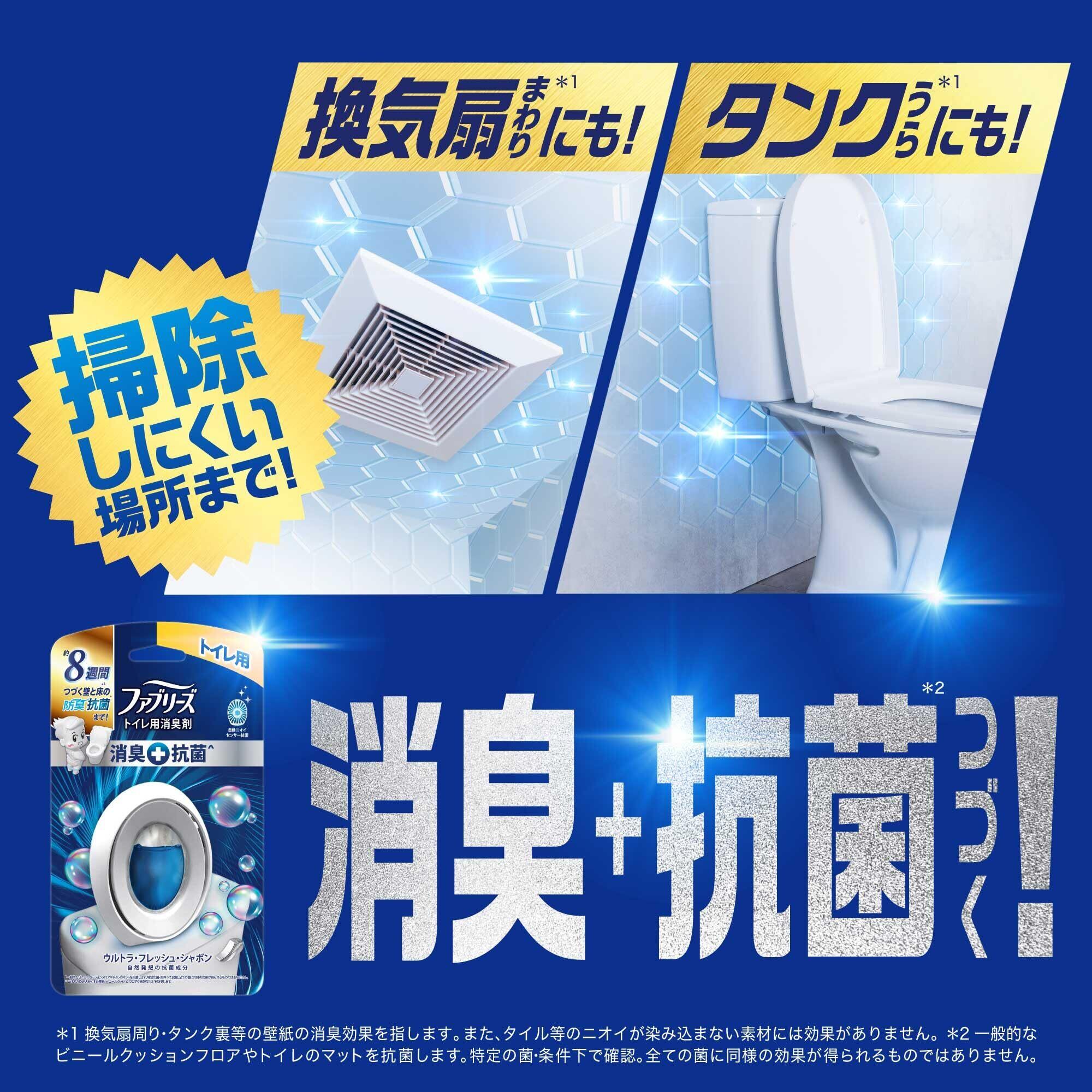 ファブリーズの次世代消臭剤!トイレの防臭+抗菌^まで! トイレでは、掃除しにくい壁紙や天井にニオイが付着し続けるだけでなく、床にも菌が継続的に増殖するのです。 ファブリーズトイレ用消臭剤+抗菌^なら、自動ニオイセンサー技術+抗菌^で、防臭に加えて菌の増殖を防ぎます。