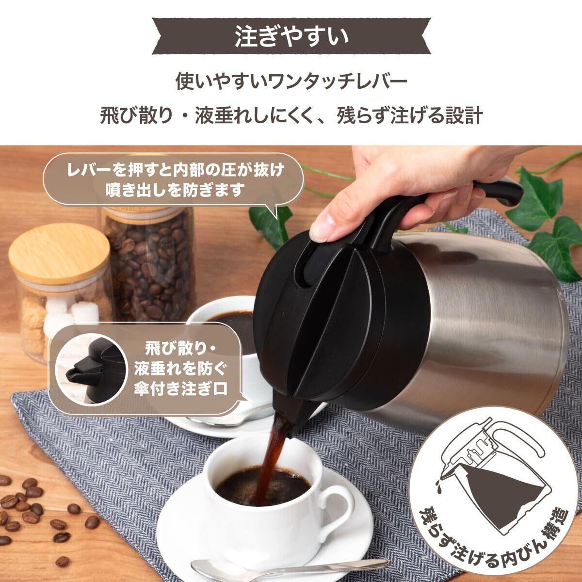 材質:内ビン・胴部/ステンレス鋼 口金・ハンドル・中栓・ふた/ポリプロピレン レバー/ABS樹脂 パッキン/シリコーンゴム