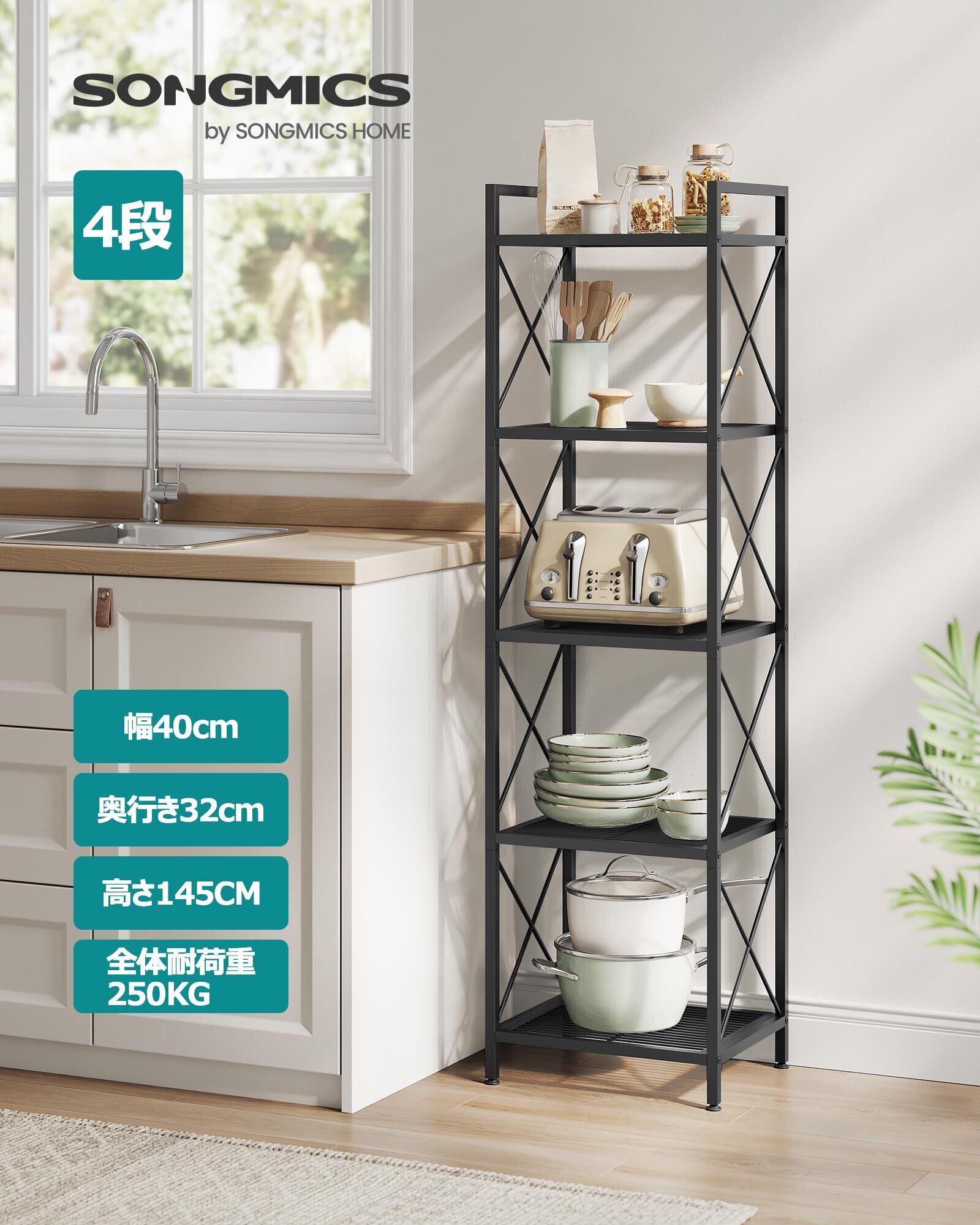 SONGMICS オープンラック 幅40 スリムメタルラック 5段 スチールラック 棚 ラック キッチンラック 収納ラック オープンシェルフ 耐荷重250KG アイアンラック 収納棚 大容量 整理棚 本棚 シェルフ棚 すき間収納 幅40x奥行32x高さ145.5cm BSC145B01