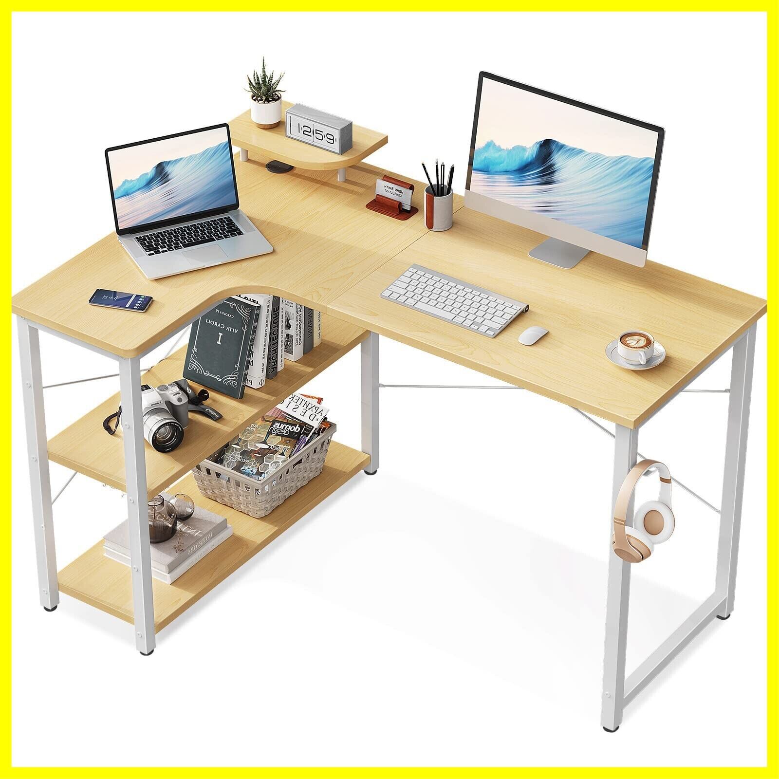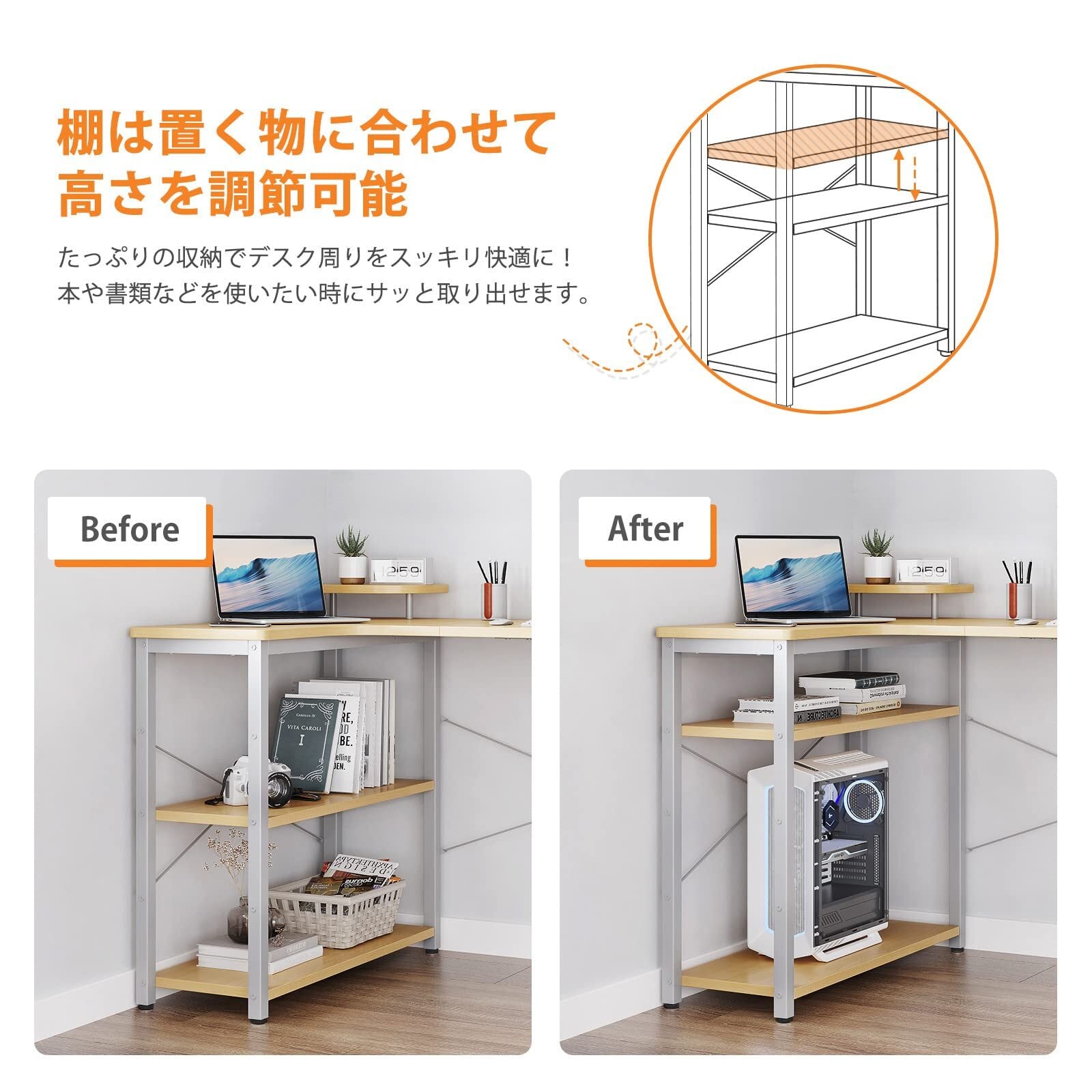 【ラック付きデスク】デスクの足元には一体型のラックが備え、本や書類などを使いたい時にサッと取り出せます。また、L字型のデザインで部屋のコーナーを最大限に活用でき、ご家庭でもオフィスでも、日常の操作に十分なスペースを確保できます。