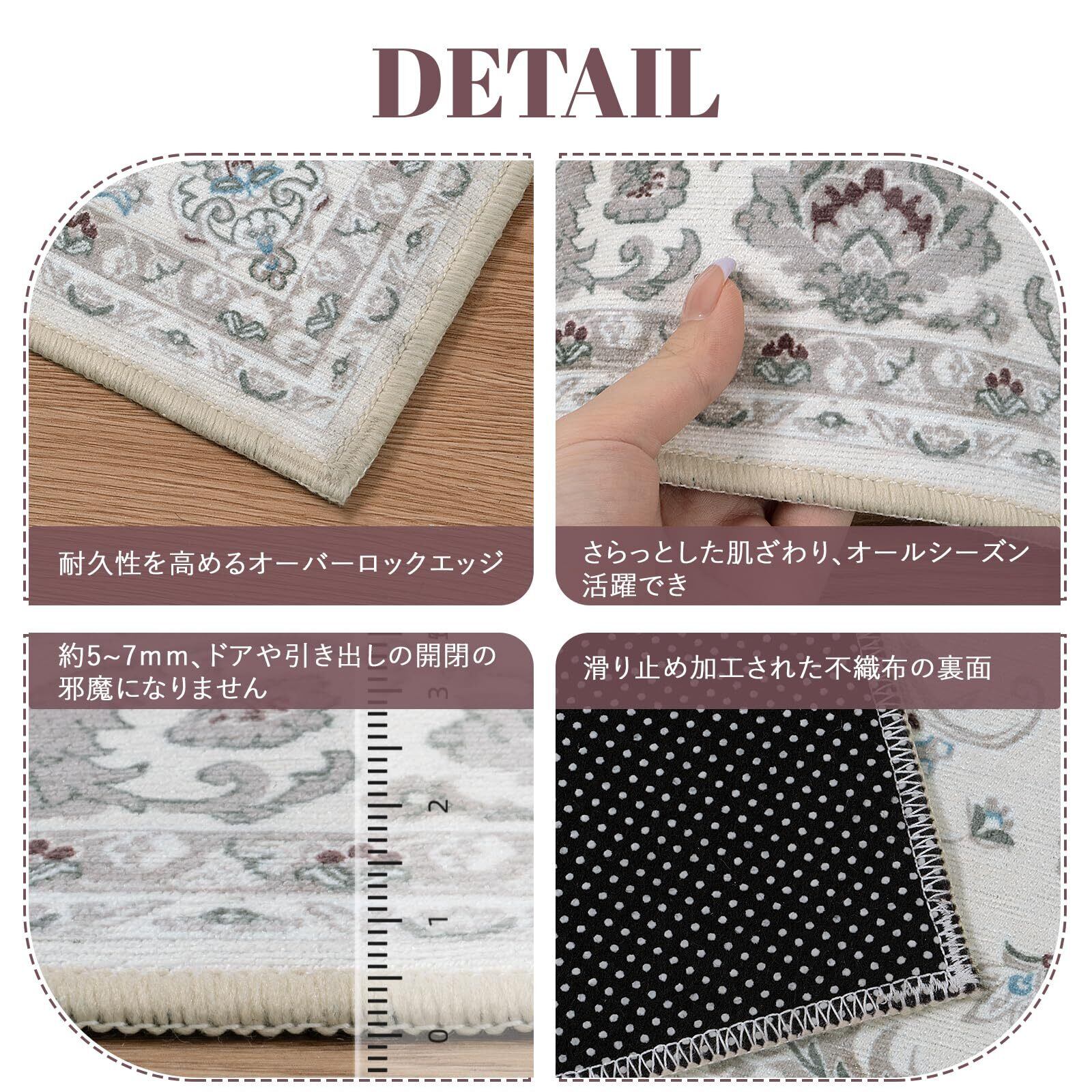 【ペルシャ風デザイン】先端の印刷技術より駆使され、平織り生地に繊細な画像がプリントされ、絨毯の上品さ を演出します。また、伝統的なペルシャ風柄を現代にアレンジし、シンプルなお部屋のアクセントとしてもおすす めします。端縁にはオーバーロックの加工を施し、遊び毛が出たり、形を崩れたりしにくく、優れた耐久性を実現 します。更に、角は細いパイピングで、軽やかな印象に仕上げています