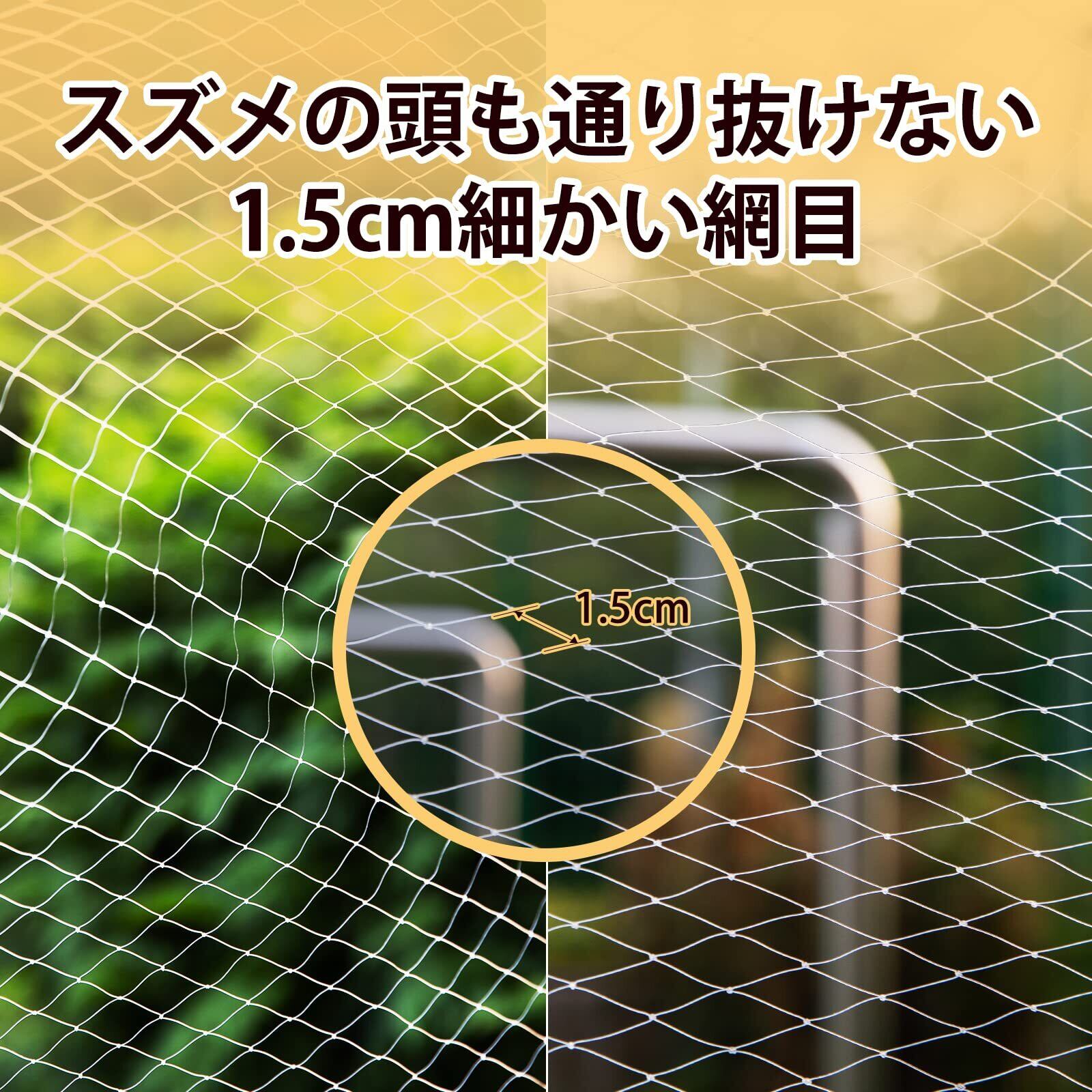 [15mm細かい網目 ほとんどの害鳥に対応可能] 15mmの極細網目を採用し、ハトやカラスなど大型な鳥類はもちろん、スズメなど小さな鳥たちもしっかり避けます。ネットが15mm目以上の場合、スズメなどの小型な鳥類は網目を通りぬける可能性がありますので、ご注意ください。