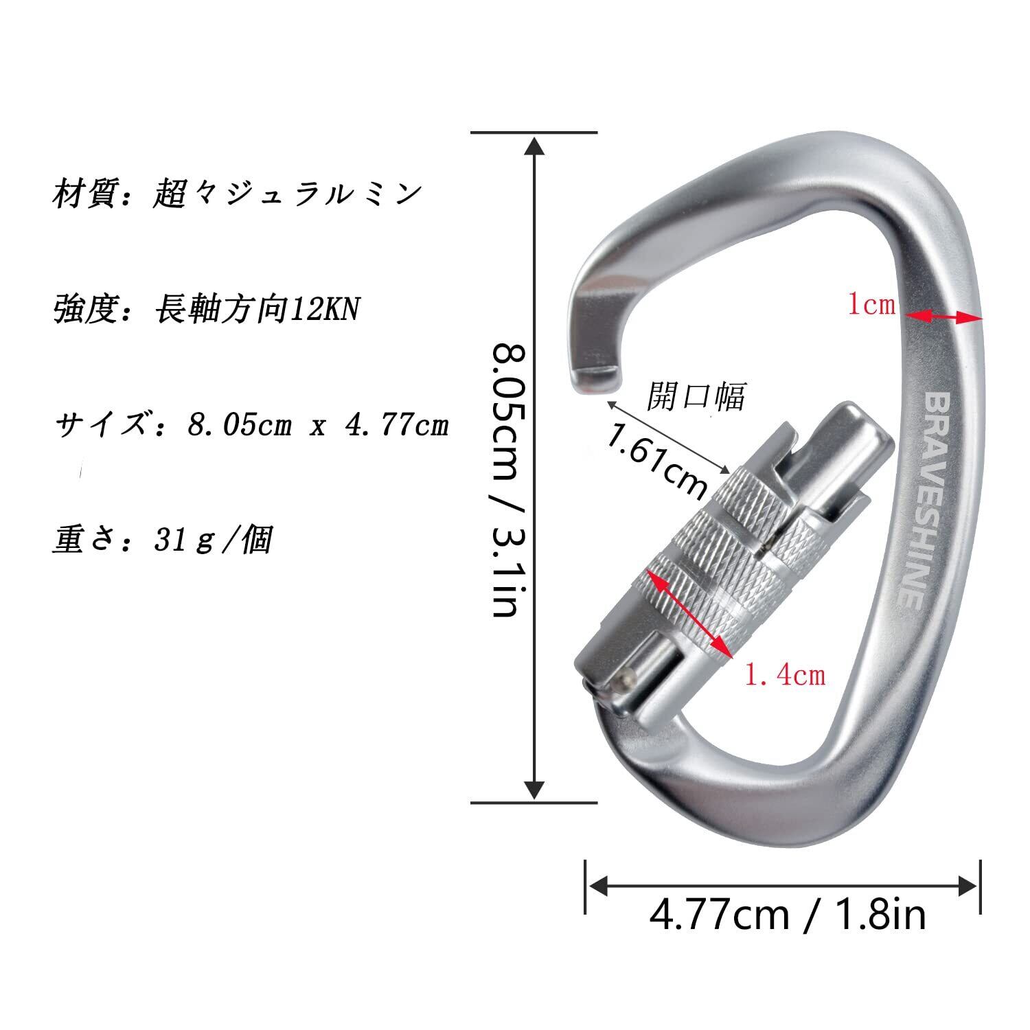材質:超々ジュラルミン 強度:長軸方向12KN(耐荷重1200KG) サイズ(L×W):8.05cm x 4.77cm(開口幅1.61cm) 重さ:31g/個