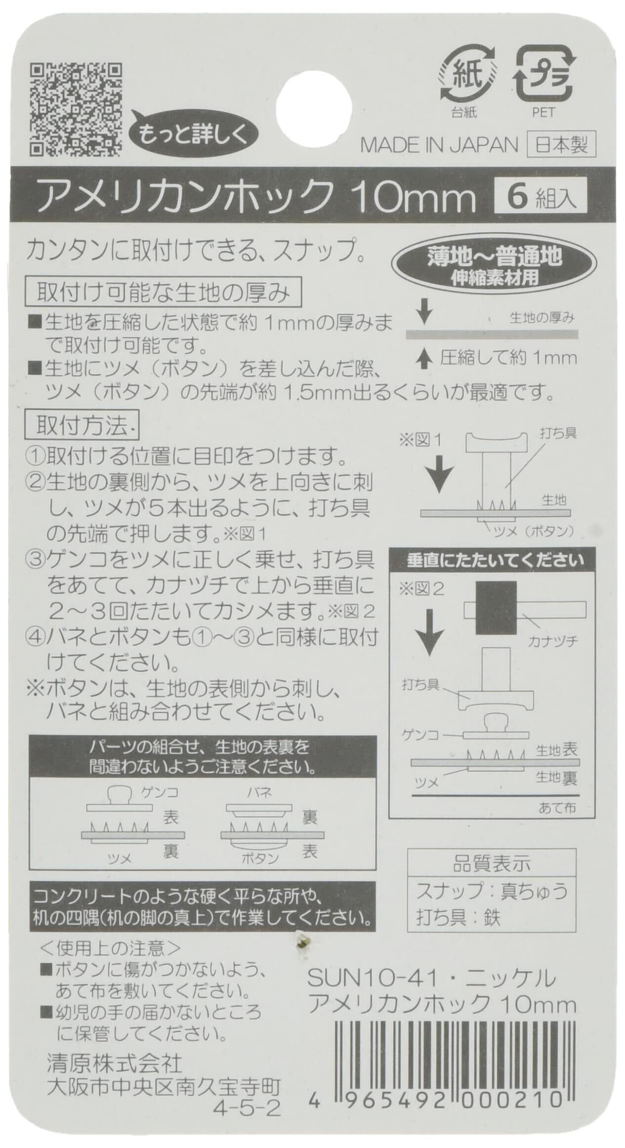 KIYOHARA サンコッコー アメリカンホック 6組入り 直径10mm ニッケル 打ち具付き SUN10-41