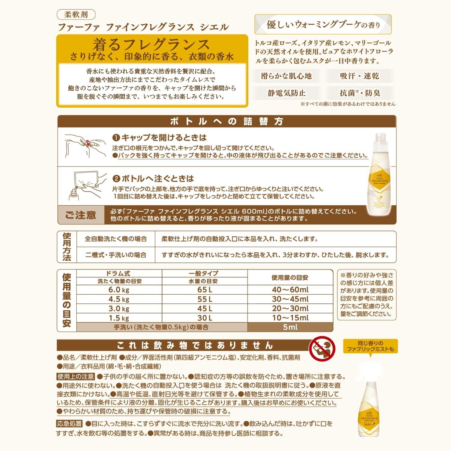 ●ご注意…必ず「ファーファファインフレグランス ボーテ 600ml」のボトルに詰め替えてください。他のボトルに詰め替えると、香りが移ったり液が固まることがあります。