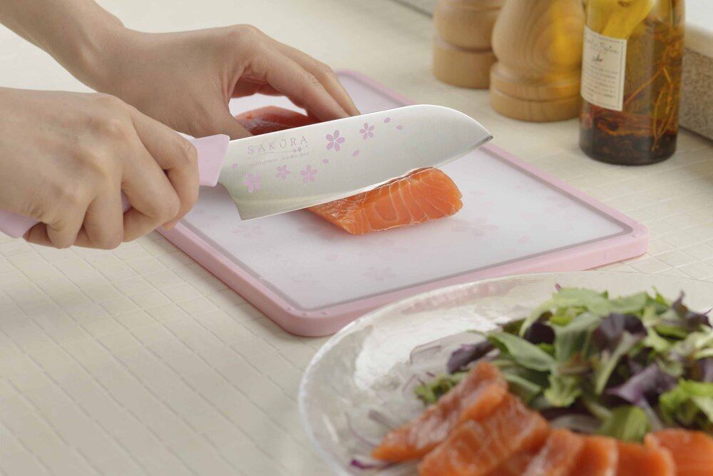 軽くて扱いやすいまな板!まな板のフチ巻加工と四隅の凹凸形状によって、すべりにくくなっています。両面の使い分けが一目でわかる色違い!野菜用、魚・肉用などに使い分けがわかりやすく便利です。きれいな桜模様のまな板、扱いやすいサイズです。 品番 34629 材質 本体:ポリプロピレン(耐熱100℃)縁部:熱可塑性エラストマー樹脂(耐熱100℃)、中身:合成紙 サイズ 幅30×奥行21×厚さ1cm 重量 355g 生産国 日本 JANコード 4957423064262