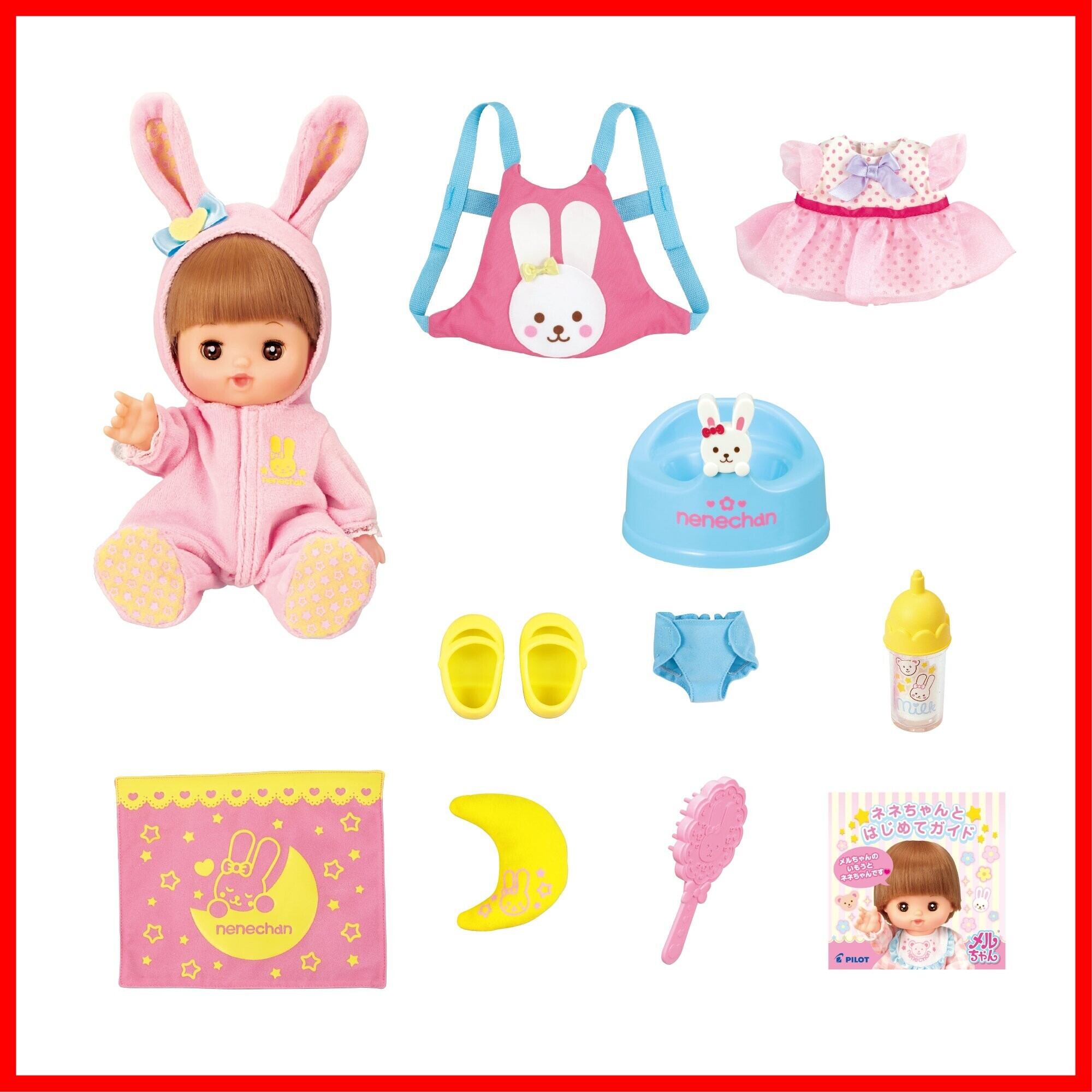 セット内容:ネネちゃん(パンツ付)、うさぎベビーオール、ベビーキャリア、ワンピース、おむつ、ベビーチェア、ブラシ、ミルクびん、おふとん、まくら、くつ、はじめてガイド、(限定セットだけのおまけ)おせわてちょう