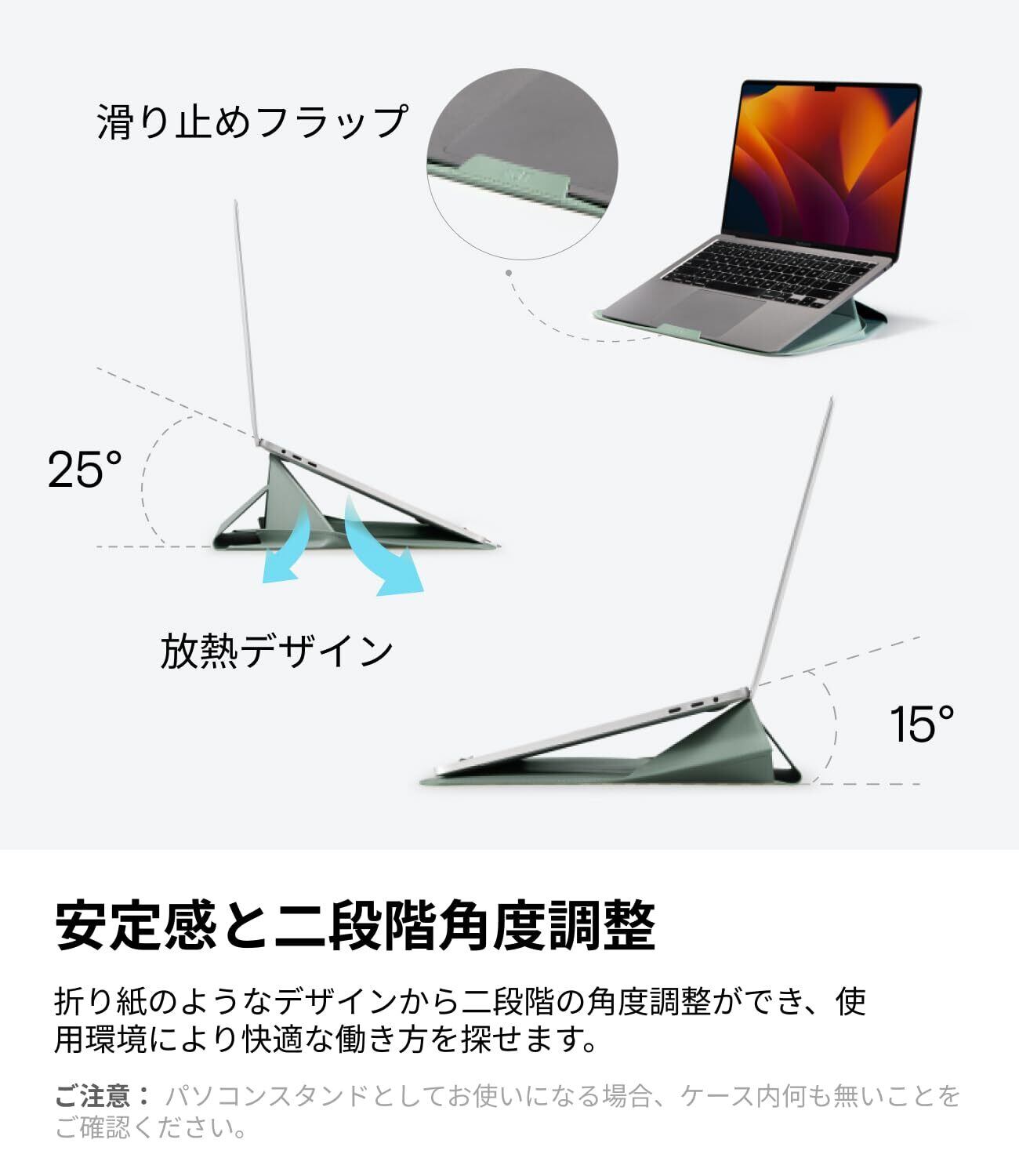 【1秒でPCスタンドに】MOFTスリーブケースは収納・保護だけでなく、スタンド機能も付いています。薄さわずか7㎜ながら2段階の角度調節に対応しています。デスクでも、膝の上でも、あらゆる姿勢での作業をより快適にしてくれます。