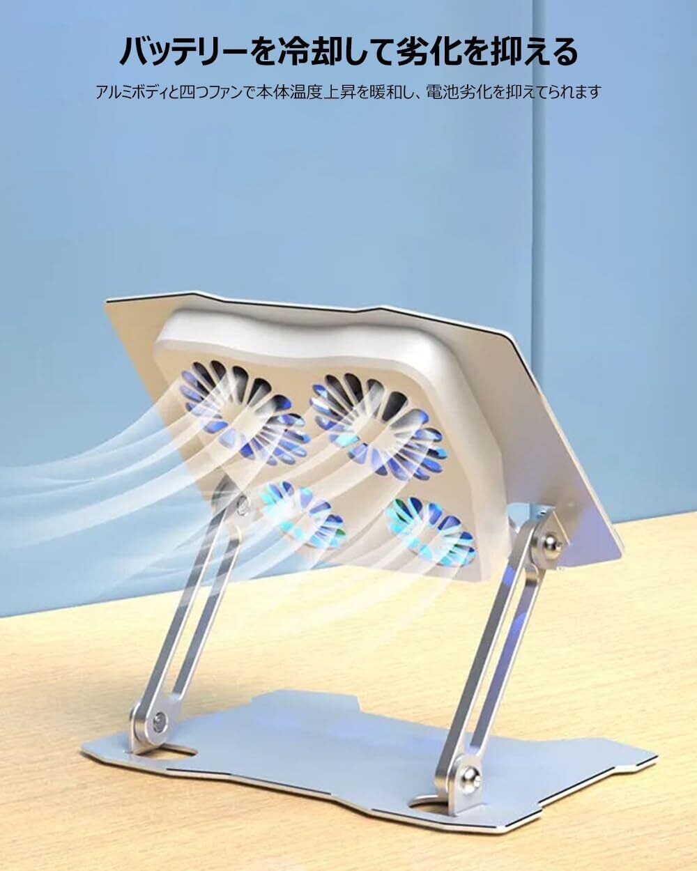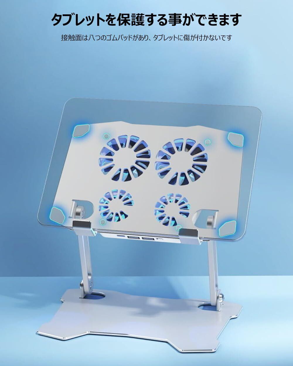 タブレット 冷却スタンド iPad 冷却ファン アルミ合金製 mac mini(m4)冷却台 四つファン付き 2つUSBポート付き 折りたたみ 低騒音 角度調整 人間工学設計 姿勢改善 滑り止め付き ゲーム/絵描き用 iPad Pro,mini,Air 7.9-13インチタブレット対応