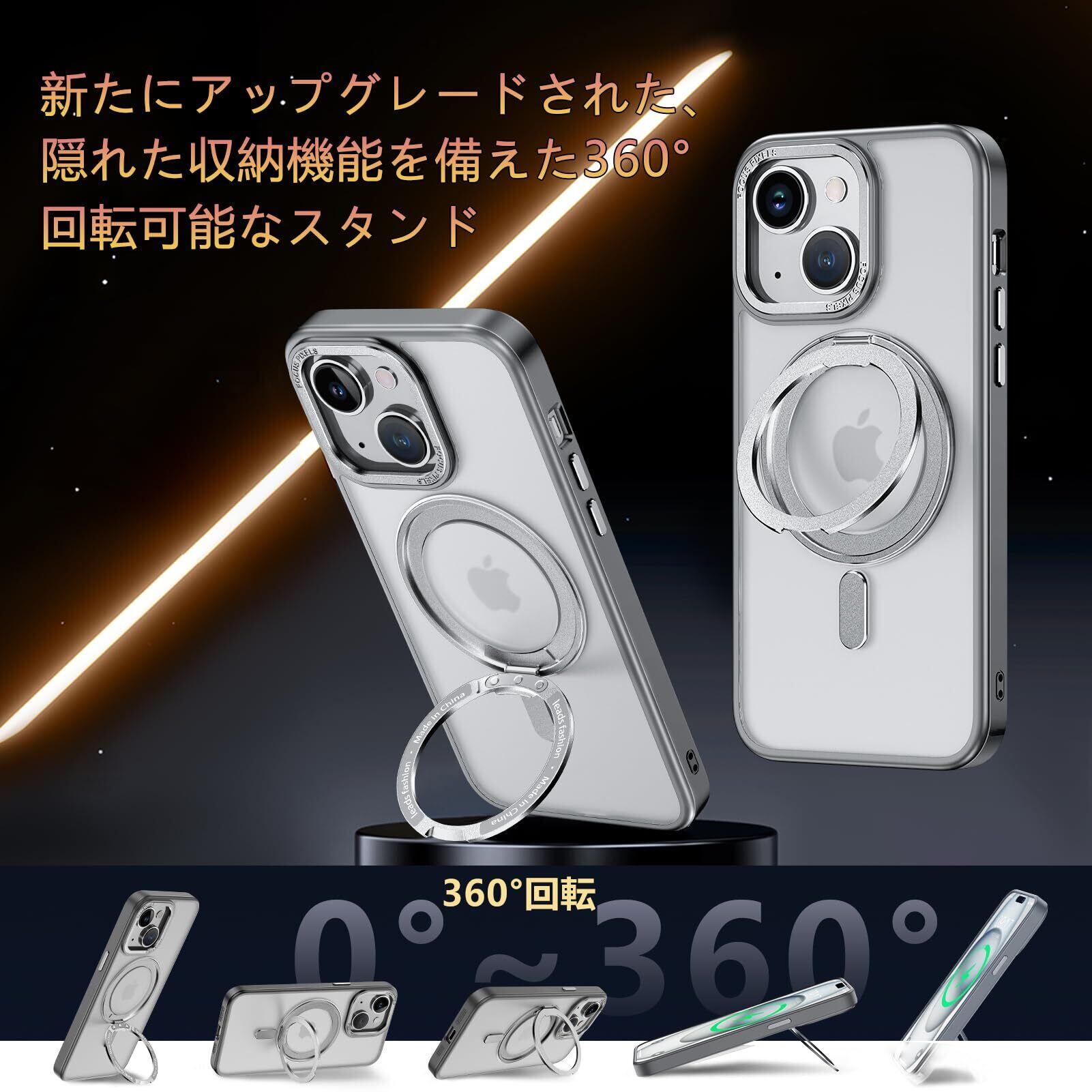【360度!隠し多機能スタンド】多機能スタンドがあれば、映画鑑賞も横向きで心地よく楽しめ、縦向きにはオンライン学習や仕事が効率的に。好みに応じて簡単に調整でき、垂直または水平に配置しても安定したサポートを提供し、40°から120°まで自由に調整できます。外出先で気軽に使ってリラックスもできる上に、リングやスタンドを持ち歩く必要がない。隠しスタンドの設計で、省スペース性に優れ、収納するときは水平的に置けできて、持ち運びの邪魔になりません。iPhone 14 用 ケース。iPhone 13用 ケース。いphone14ケース。