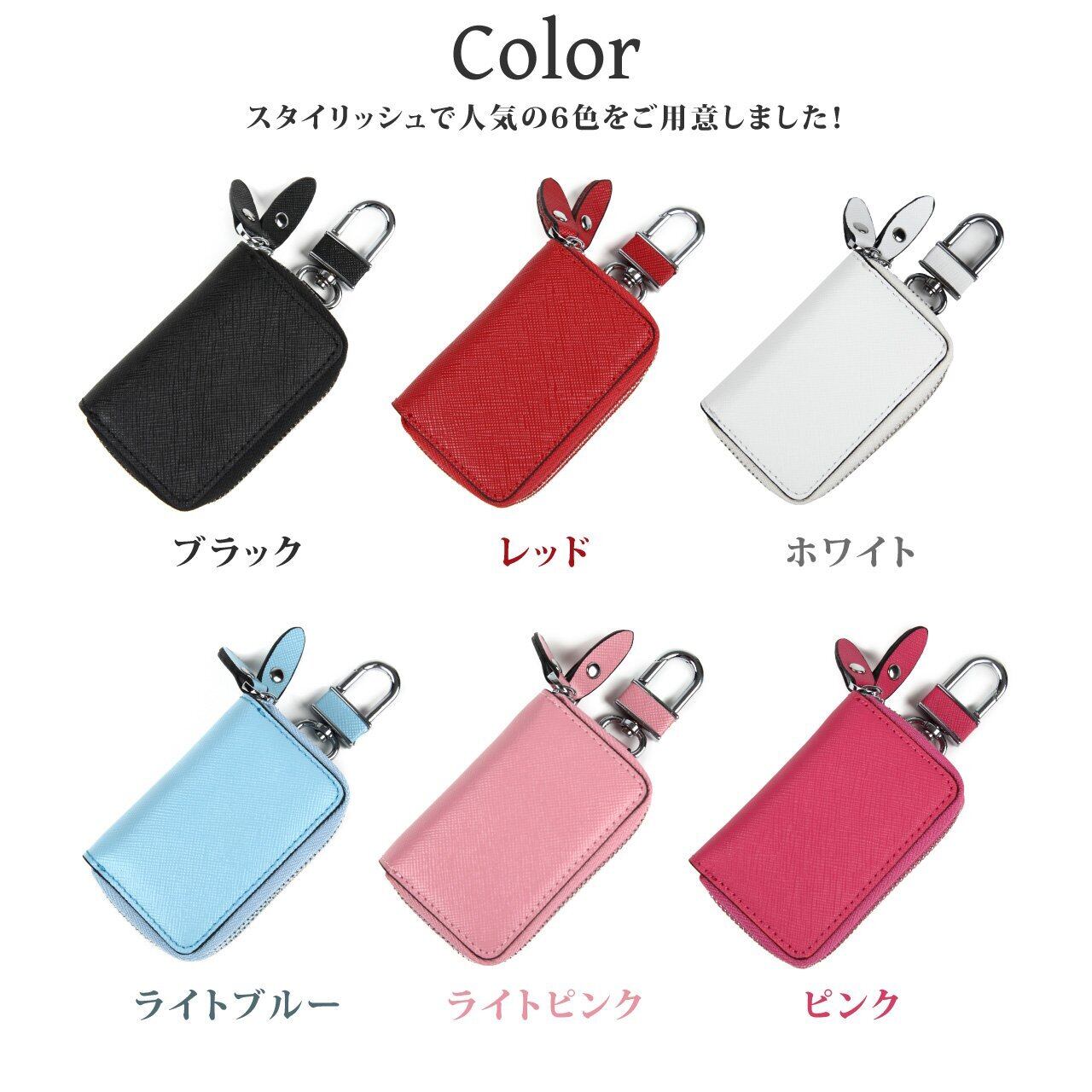 キーケースは機能性だけでなくデザインも充実。カラーバリエーションにはホワイト、レッド、ブラック、ライトピンク、ピンク、ライトブルーの6色があり、おしゃれで可愛いデザインが魅力です。