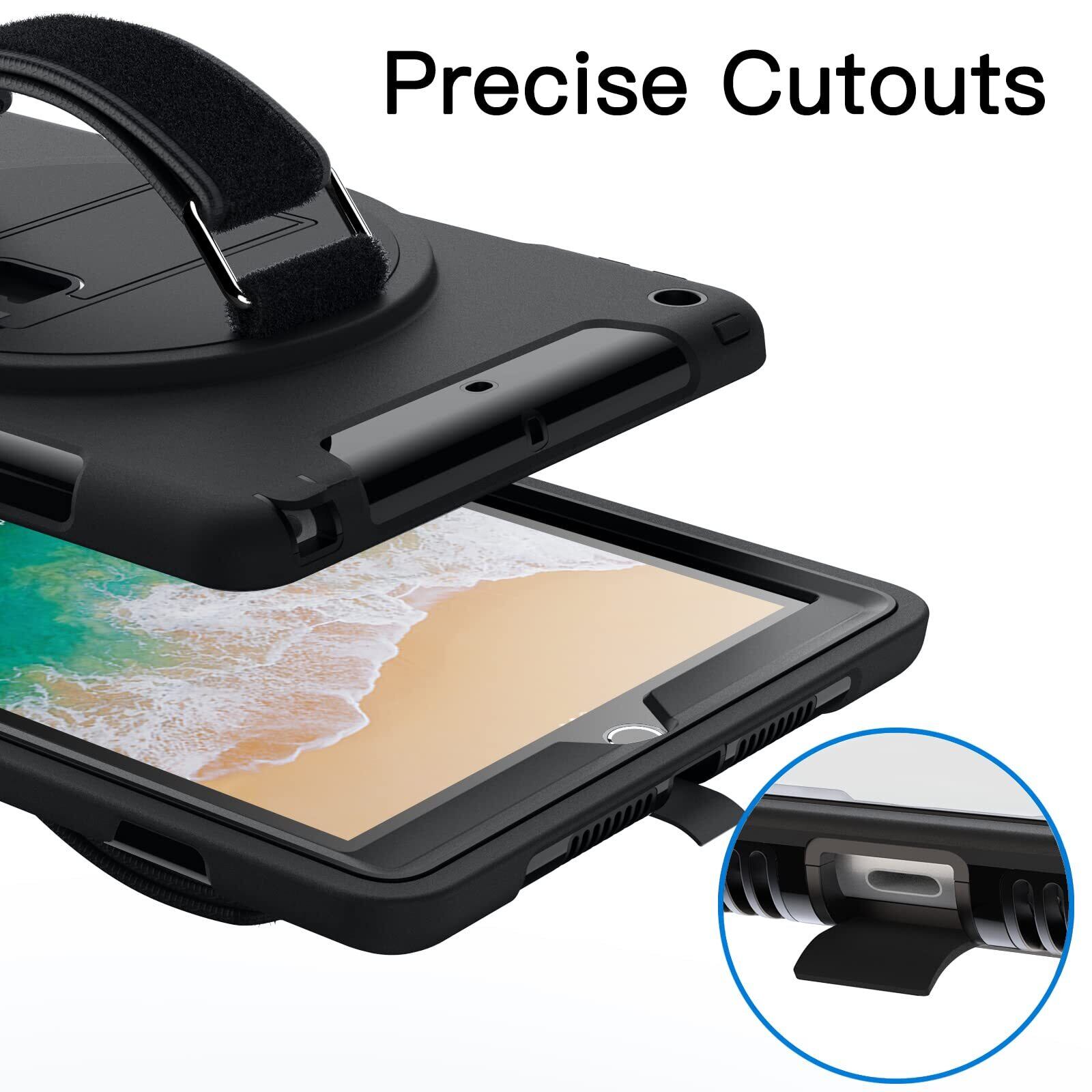JEDirect iPad 9.7インチ ケース (第6/5世代、2018/2017モデル) 液晶保護フィルム付き 保護耐衝撃頑丈なタブレットカバー 360°回転ハンドストラップスタンド (ブラック)