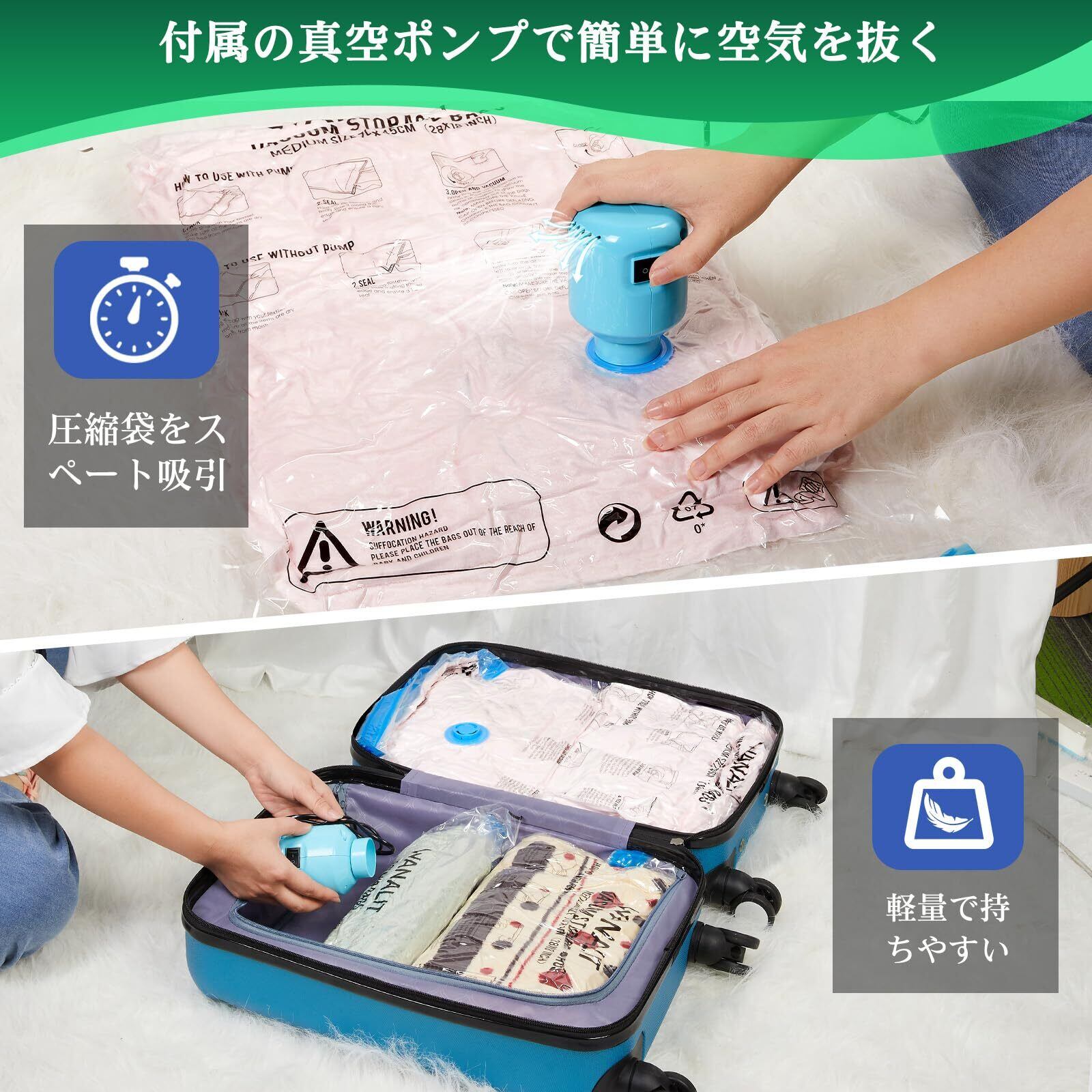 【電動ポンプ付きで簡単&迅速な圧縮】 軽量でコンパクトな電動ポンプ付き。衣類や布団を圧縮袋に入れた後、ボタン一つで素早く空気を抜け、簡単に圧縮完了。操作が簡単で、旅行先や引越し時にも便利に持ち運べます。過熱保護機能付きで安全設計。フル充電で最大20分連続使用可能です。※80秒以上使用する場合は、一旦スイッチを切り、15分ほど冷ましてから再度ご使用ください。