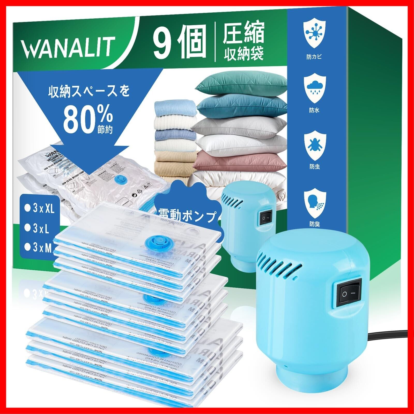 WANALIT 布団圧縮袋 9枚セット 電動ポンプ付き 【100×70cm×3枚/80×56cm×3枚/70×45cm×3枚】 布団/衣類/旅行用 防湿・防塵・防臭