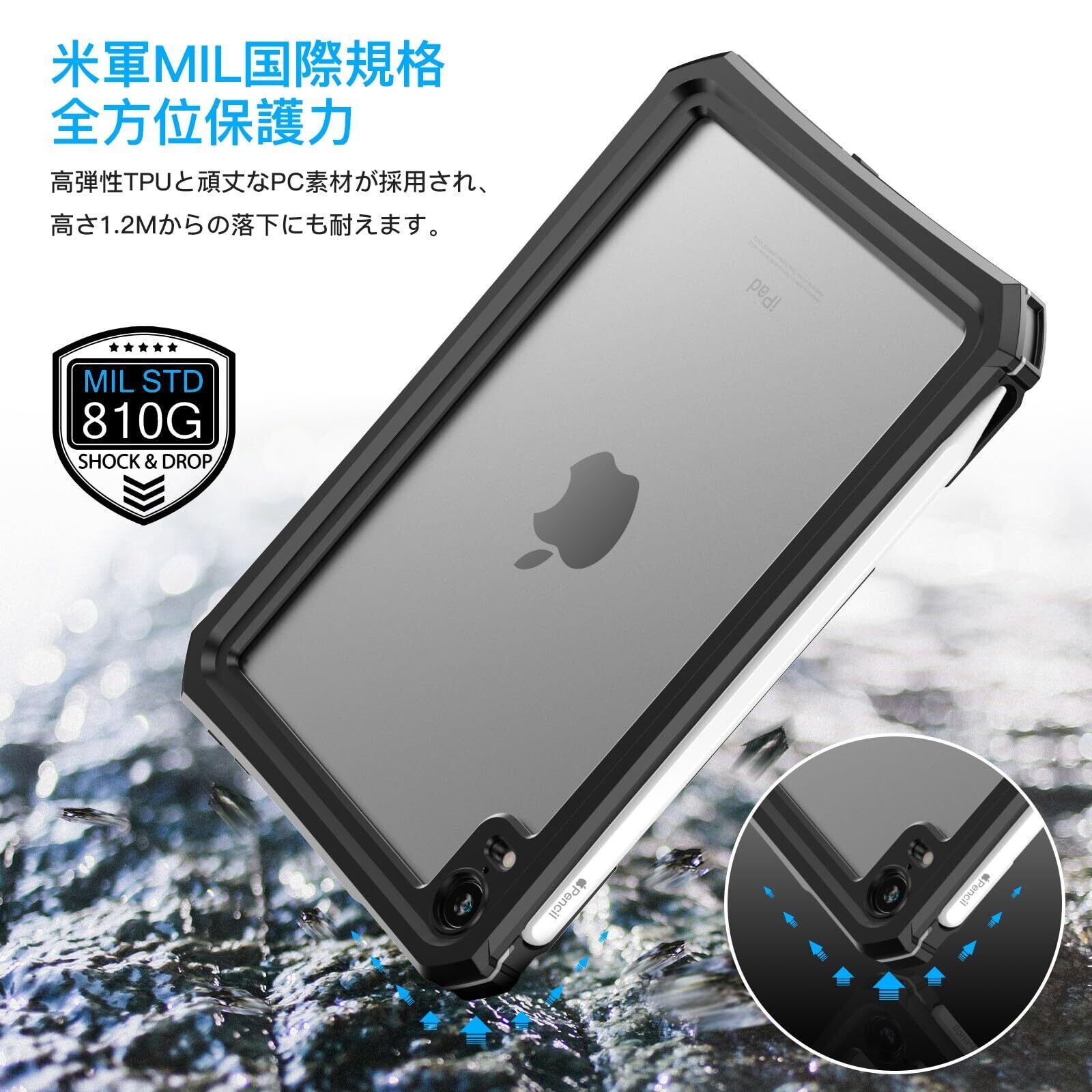 【IP68規格防水認証】IP68防水認定を取得しております。水深さ2Mの水中に30分間まで水没できます。水気の多い場所でもアイパッドを守ってくれるため、いつもで安心してご利用いいただけます。温泉/お風呂で音楽やビデオを楽しみたい時、山登り、釣り、スキー、海辺、作業現場等にも大活躍です。