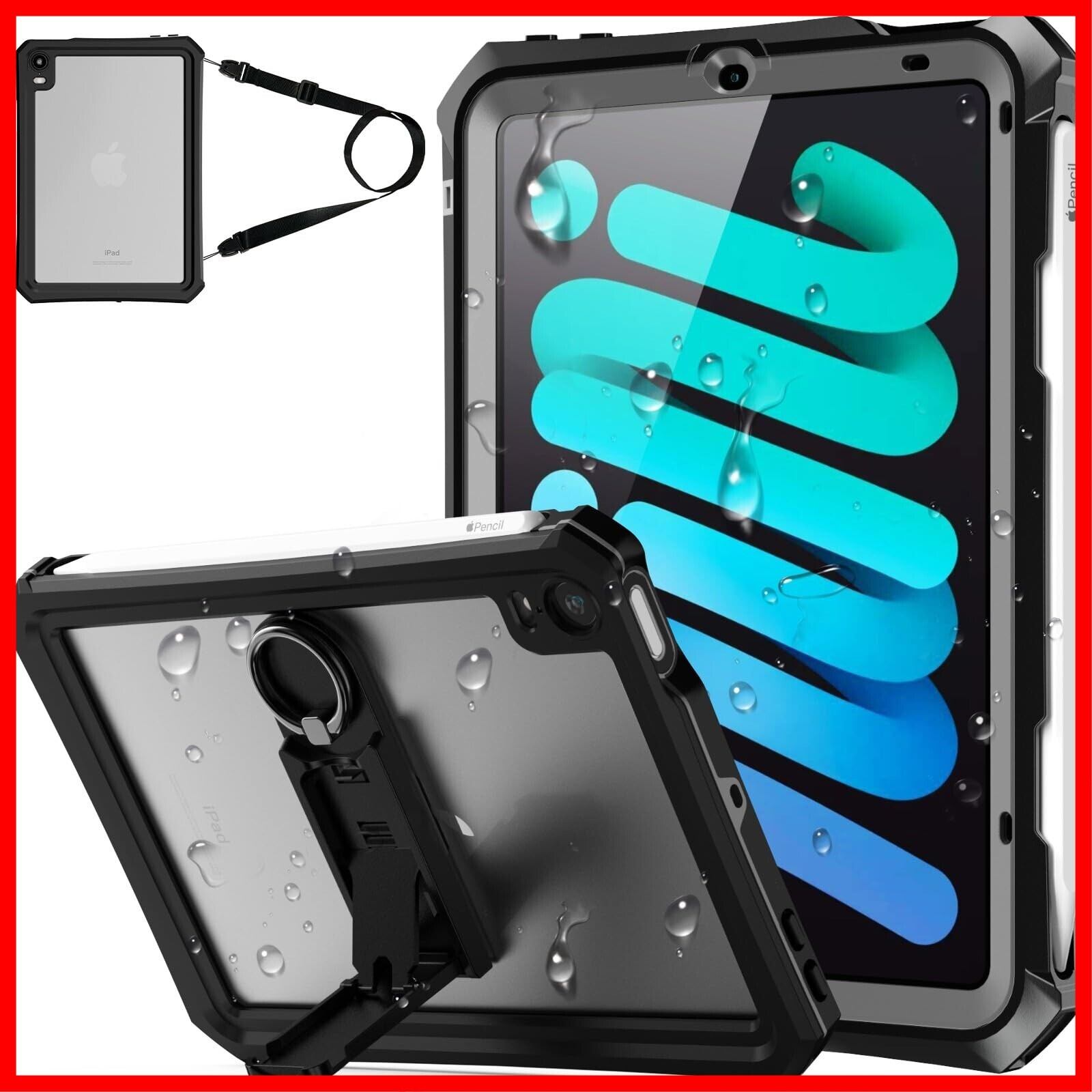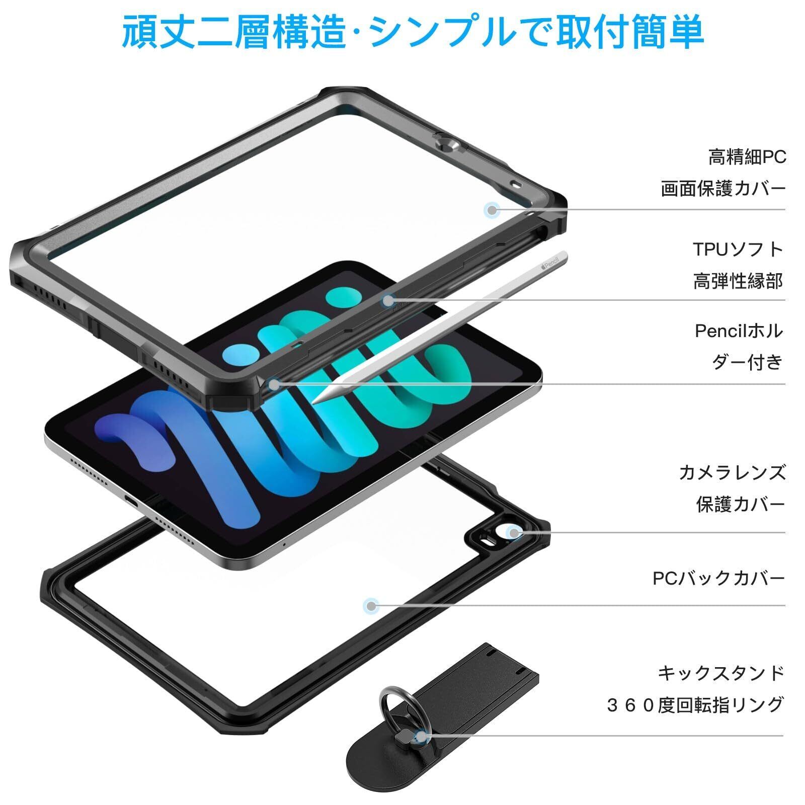 Tmacjump iPad mini7 ケース (A17 Pro 2024モデル、第7世代)、iPad Mini6 ケース(2021モデル、第6世代) 8.3インチ IP68 完全防水 防塵 耐衝撃 ペン収納 保護フィルム付 TouchID認証対応 キックスタンド ショルダーストラップ お風呂 キッチン 作業現場等に活躍 アイパッド ミニ6 ミニ7 全面保護ケース【適格請求書発行可能】