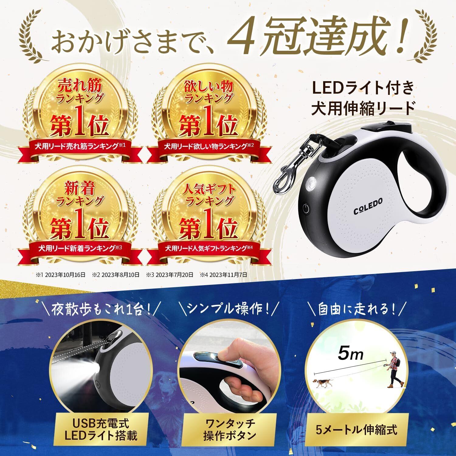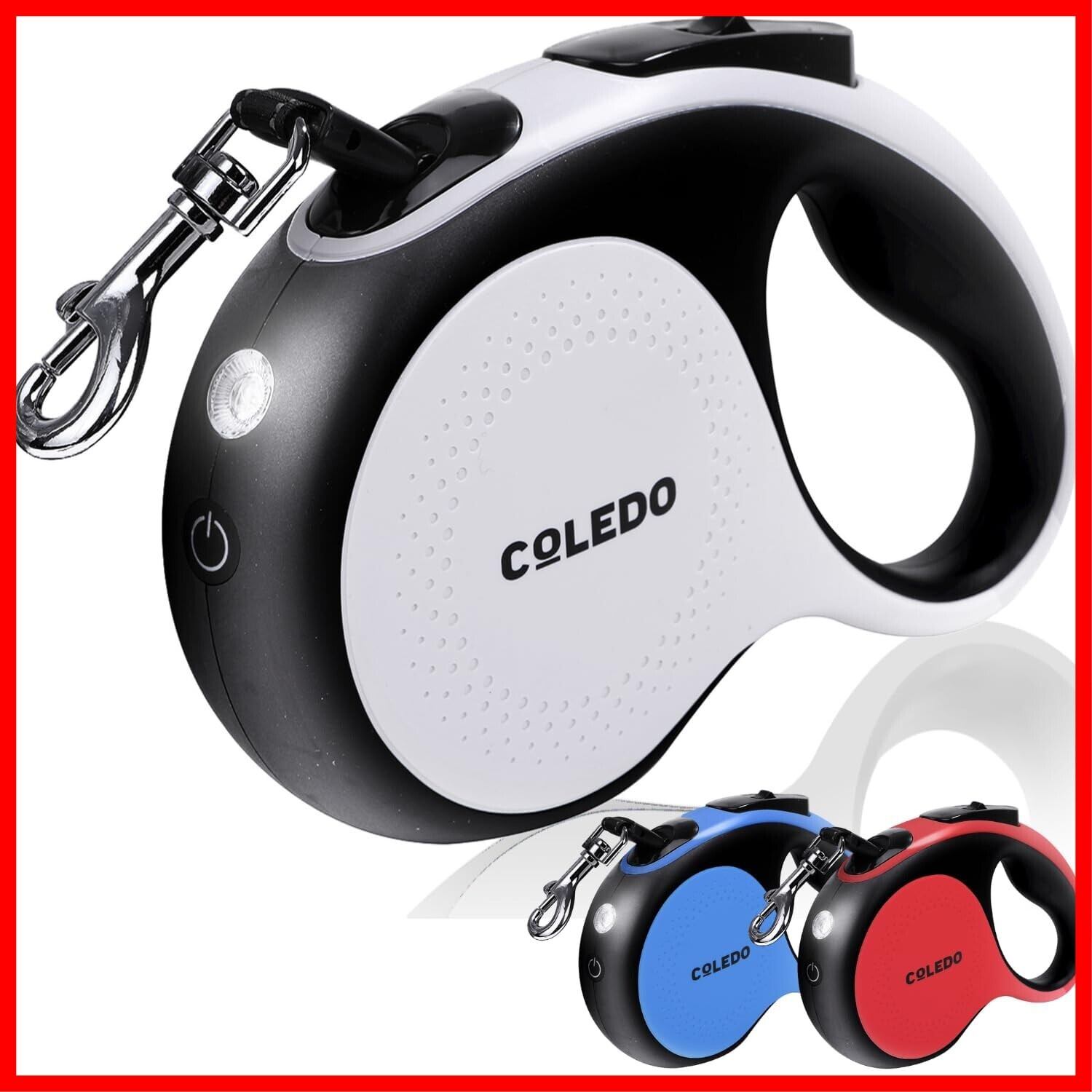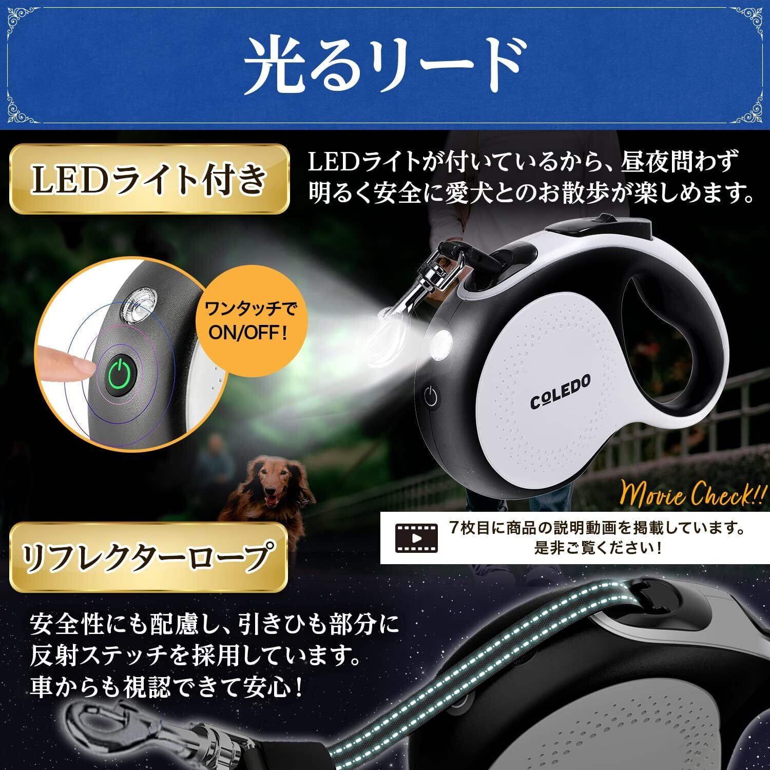 COLEDO 犬 リード 伸縮 【 LED ライト付き 】 USB 充電式 5m 小型犬 中型犬 大型犬 [ 長さ : 5メートル 荷重 : 30kg ] (ホワイト)