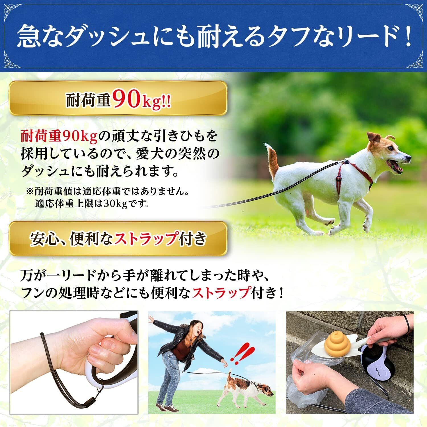 【頑丈設計&便利なストラップ】耐荷重90kgの非常に頑丈な犬用リードで、愛犬が急に駆け出しても安心して使用できます。万が一リードが手から離れてしまっても、付属のストラップを手首にかけておけば、犬が逃げてしまったり事故を防ぐことができます。また、このストラップはフンの処理時などでリードを一時的に手放して両手を使いたい時にも非常に便利です。