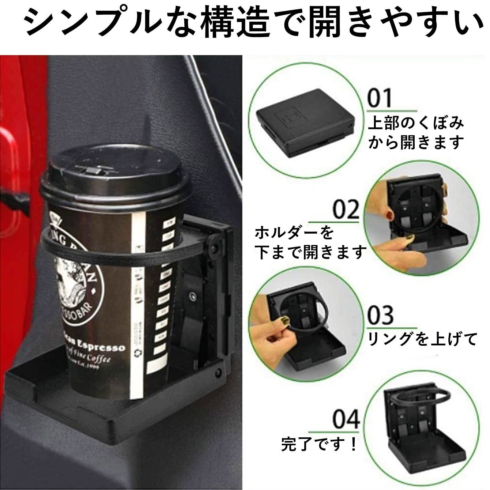 【ドリンクをしっかり保持】強度のあるプラスチック製で、ネジを固定するため外れることはなく、重い瓶なども置くことができます。ホルダーは最大直径75mmまで対応しており、ほとんどのカップや缶、水筒などのドリンクカップをしっかり保持することができます。
