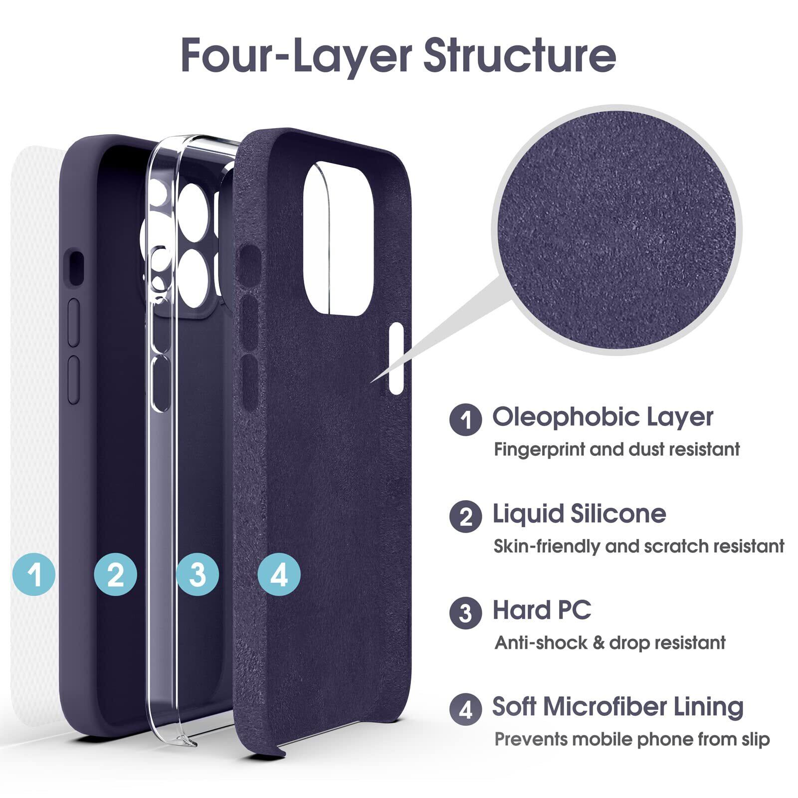 【耐衝撃・耐落下・傷防止】iPhone 14 Pro Max 液状シリコンケース、4層プロセス【液状シリコンケース】【硬質PCボード】【マイクロファイバーパッド】【撥油層】で携帯電話を摩耗や損傷から守ります。