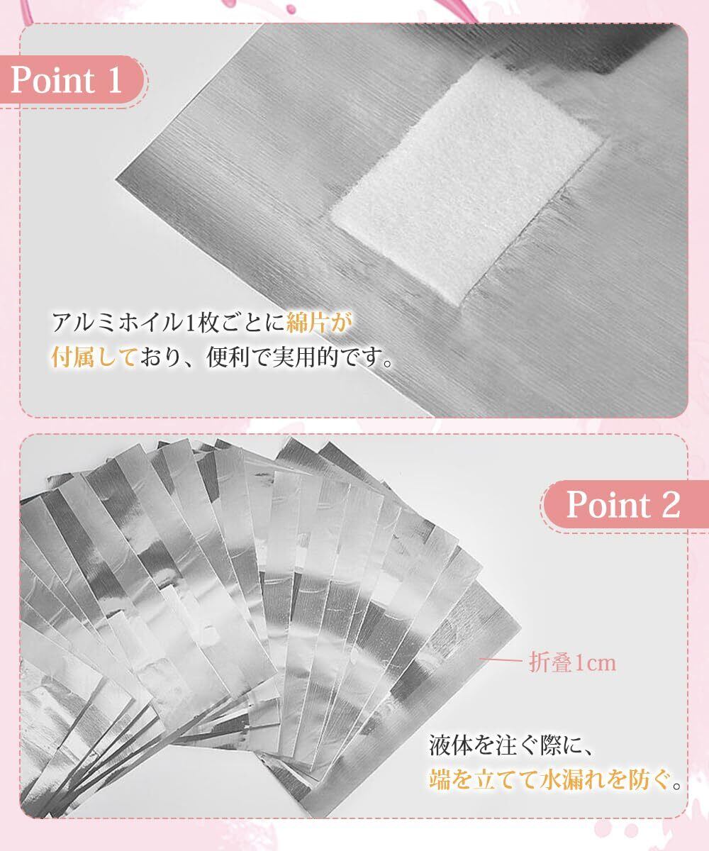 【使いやすさ】ネイルポリッシュリムーバーをコットンパッドに注ぎ、アルミホイルでしっかりと指に巻き付け、10〜15分待ってから慎重にアルミホイルを取り外し、スチールプッシャーで除去します。