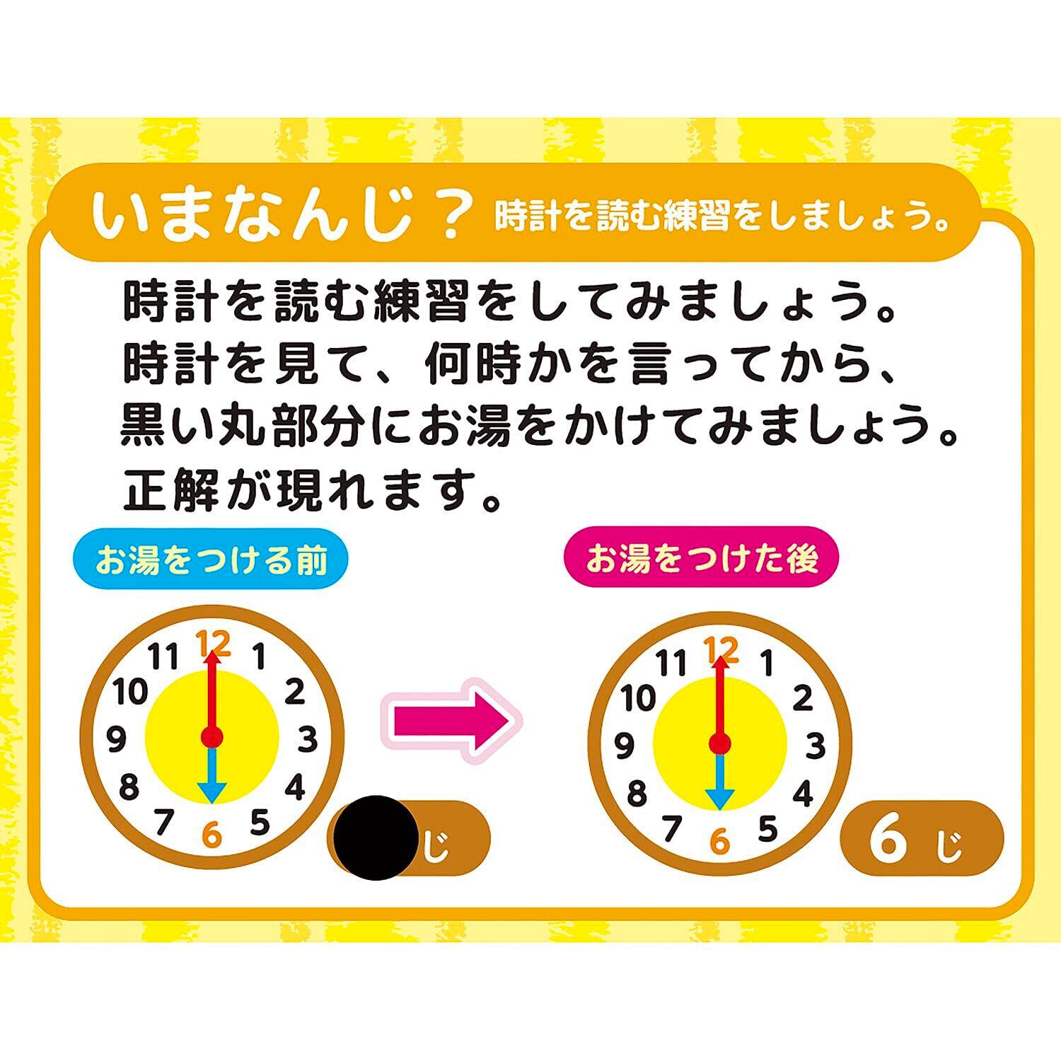 Gakkenおふろでお勉強シリーズ「おさるのジョージ おふろでもじ かず とけい」は、黒い丸にお湯をつけると文字やイラストが現れる感温インク付き!もじ・かず・とけいが楽しく学べます。おふろの壁に水をつけてシートを貼ったり、湯船に浮かべたりして、表を見ながら声に出して物やキャラクターの名前や数字を言ってみましょう。物の名前など、黒い丸で隠れています。お湯をつけると、名前が出てきます。しりとりをしたり数をかぞえたりして親子で楽しくコミュニケーションをとりながら学べるおふろシートです。(感温インクは約32℃以上で色が消え始め、約25℃以下で黒い色が着色します)