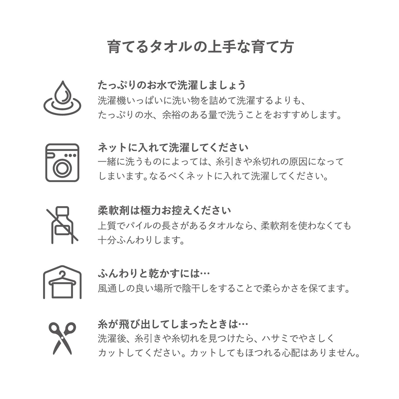 【育てるタオルとは】その名のとおり、見た目も肌触りも、使うほどに“育つ”不思議なタオル。洗うたびにタオルの糸が空気を含み、膨らむと、吸水性や速乾性も高くなっていきます。使い込むほど、水分を吸ってくれる。使い込むほど、すぐに乾いてくれる。「育てるタオル」は、そんな楽しい驚きを体験できるタオルです。