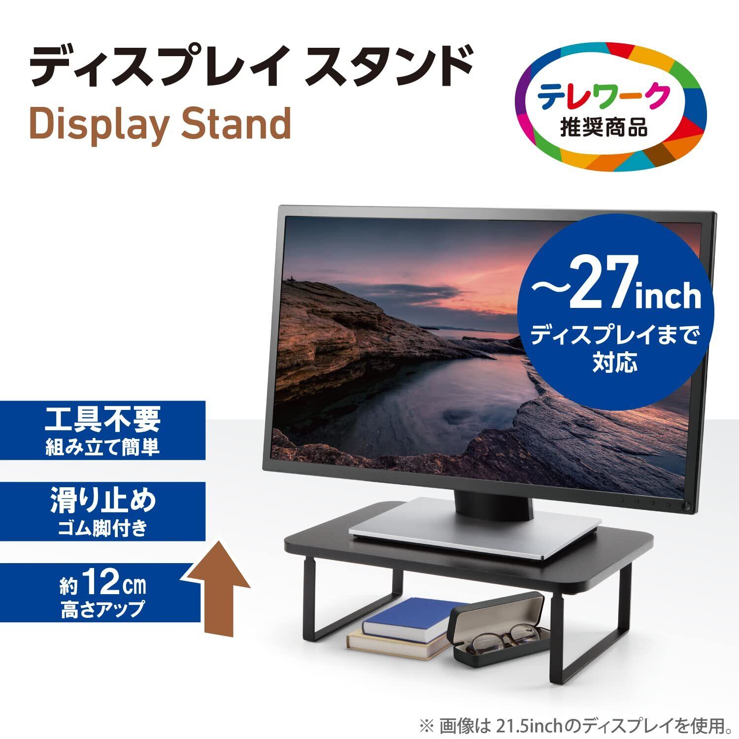 ●27インチまでの液晶ディスプレイに対応したディスプレイスタンドです。●液晶ディスプレイの高さを12cm上げることで目線をあげることができ、パソコン作業時の姿勢を改善することができます。●横幅38cmなので狭い机でも場所を取りません。●ディスプレイスタンドの下のスペースを有効活用してデスクの上を広く使うことができます。●ディスプレイスタンドの下のスペースに小物を収納可能です。●工具不要の簡単組み立て仕様です。●脚部にはゴム脚がついているので、机上に設置しても滑りにくく安定して使用できます。