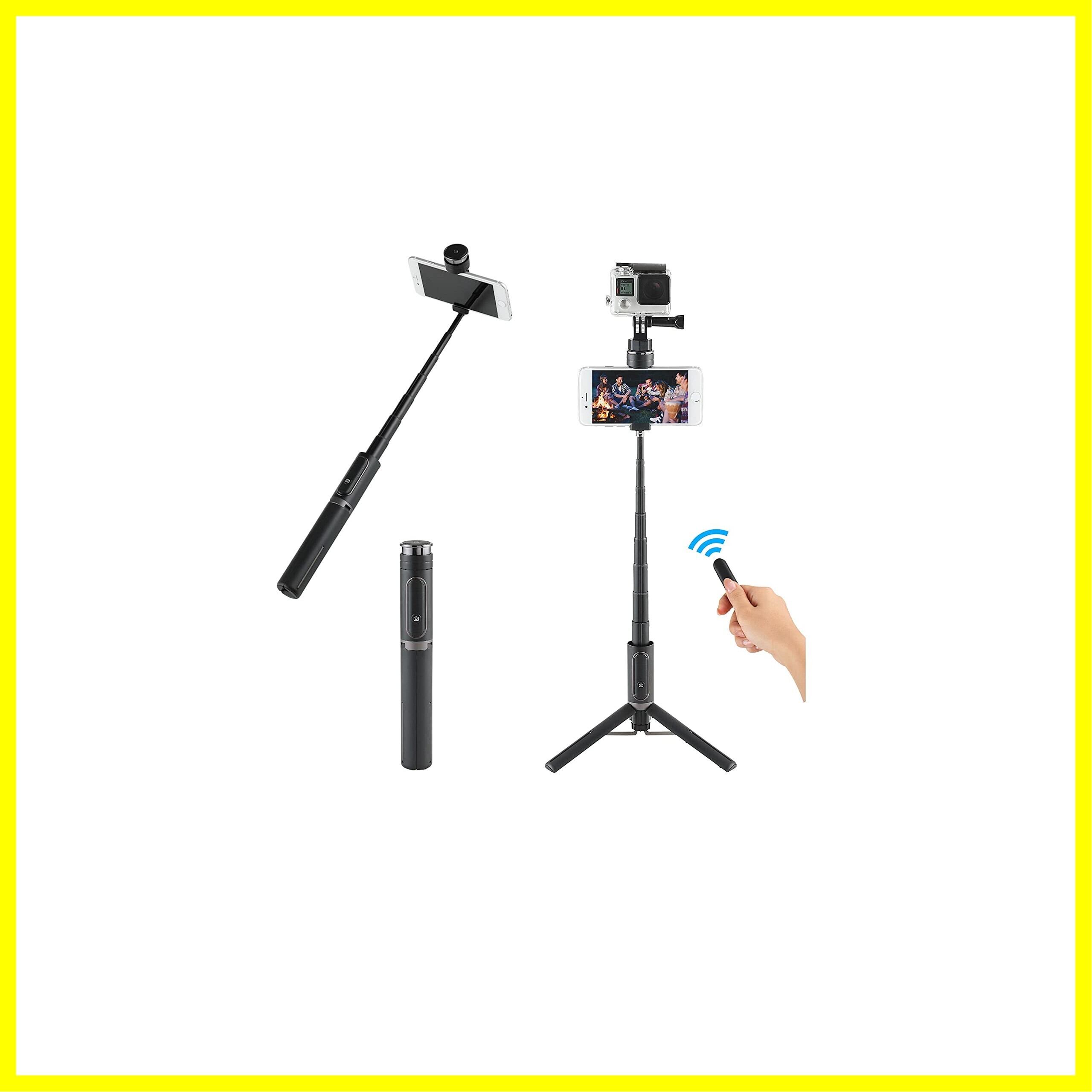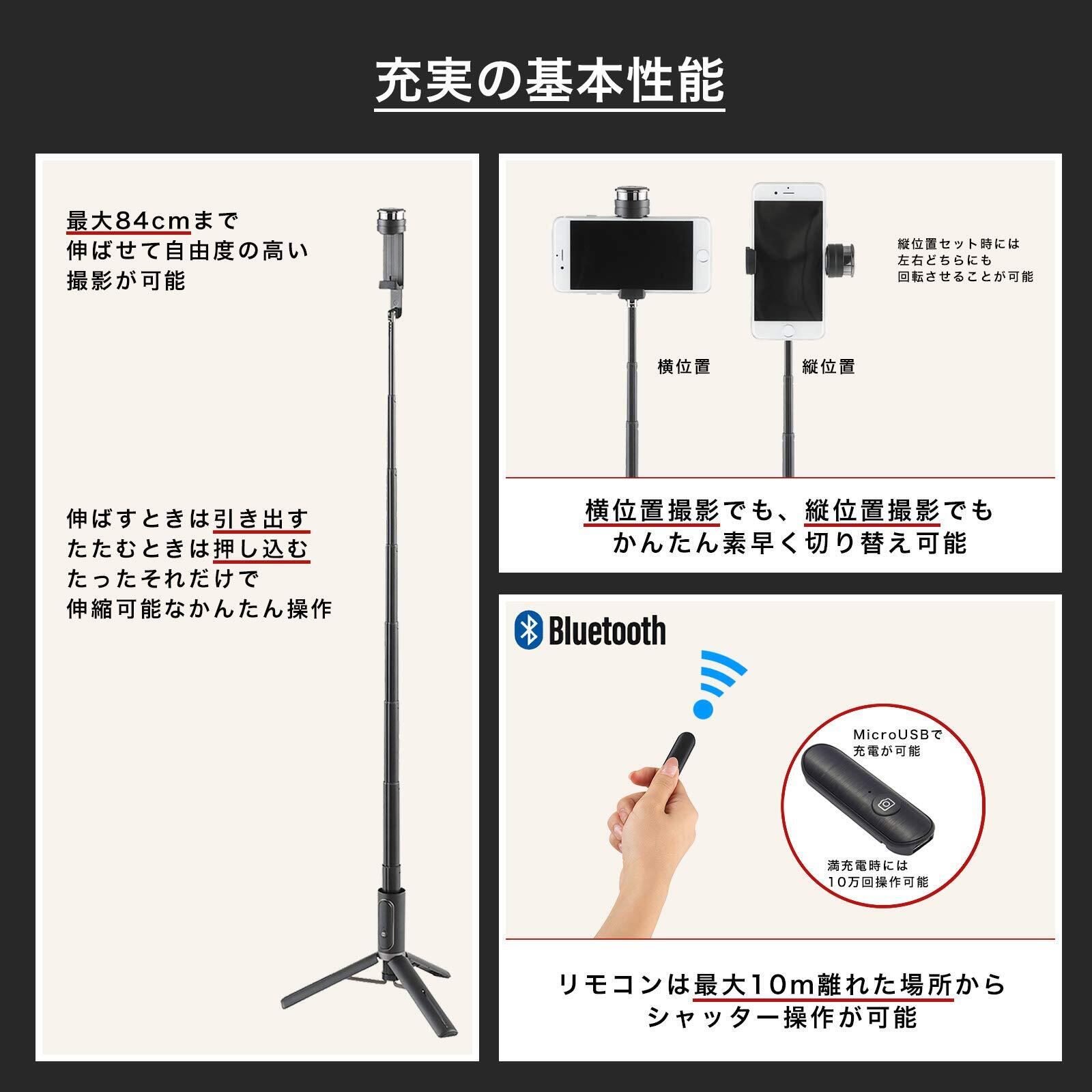 シャッターボタン付き自撮り棒が便利なスマホ三脚に大変身、先端にカメラねじ装備で2台撮影も可能。