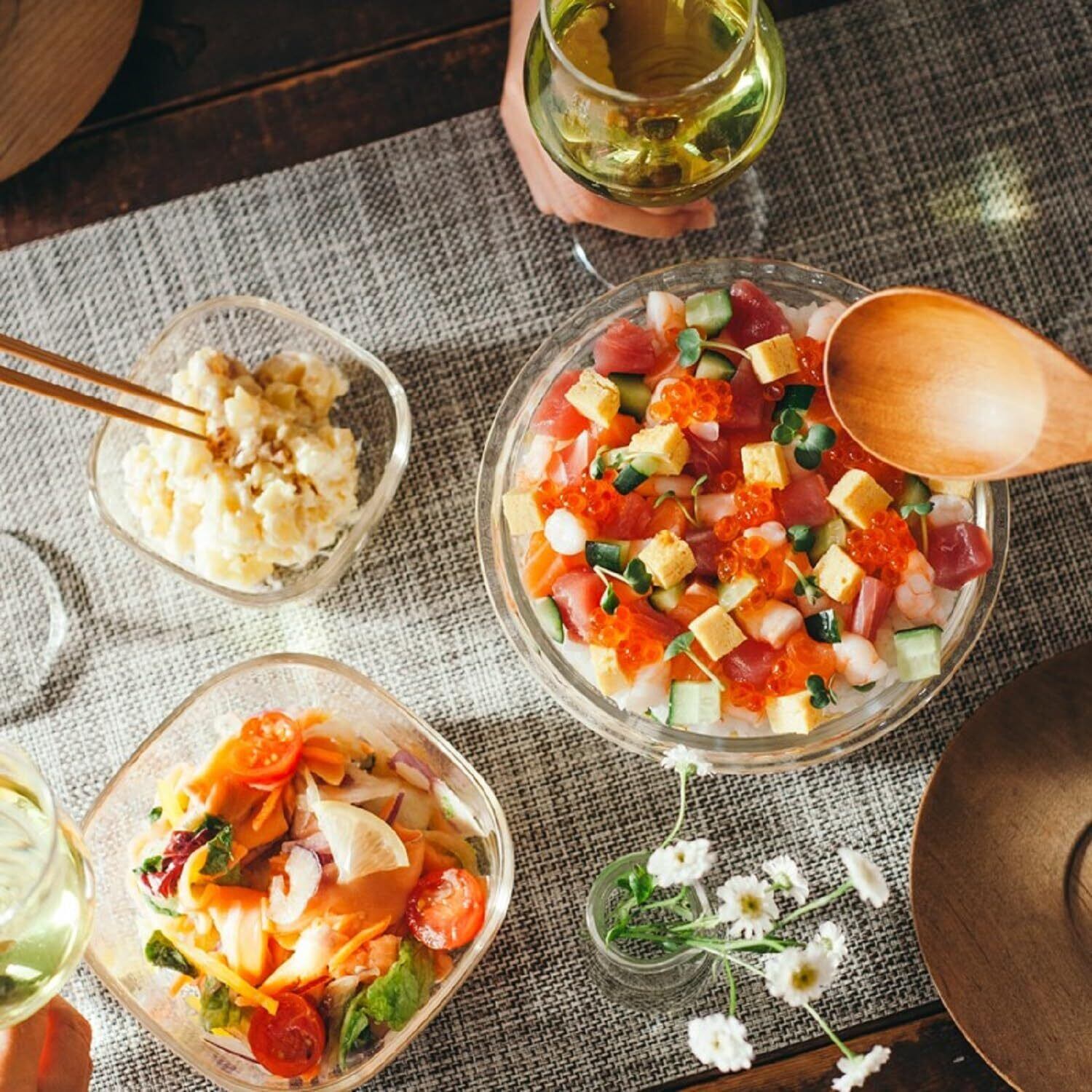 シンプルなデザインで料理を選ばず使える食器。透明で中身が見えるため、料理と一緒に見た目も愉しめる。