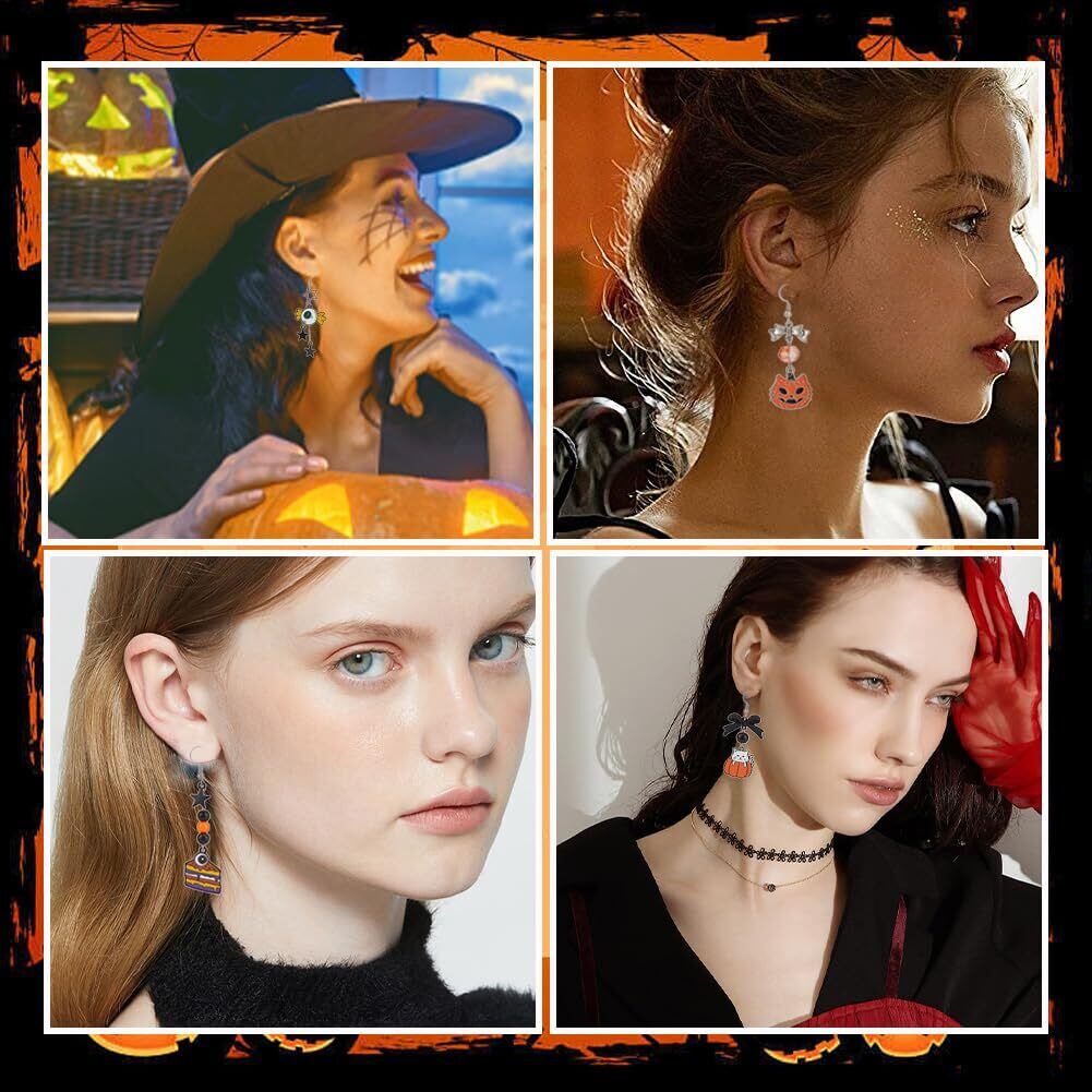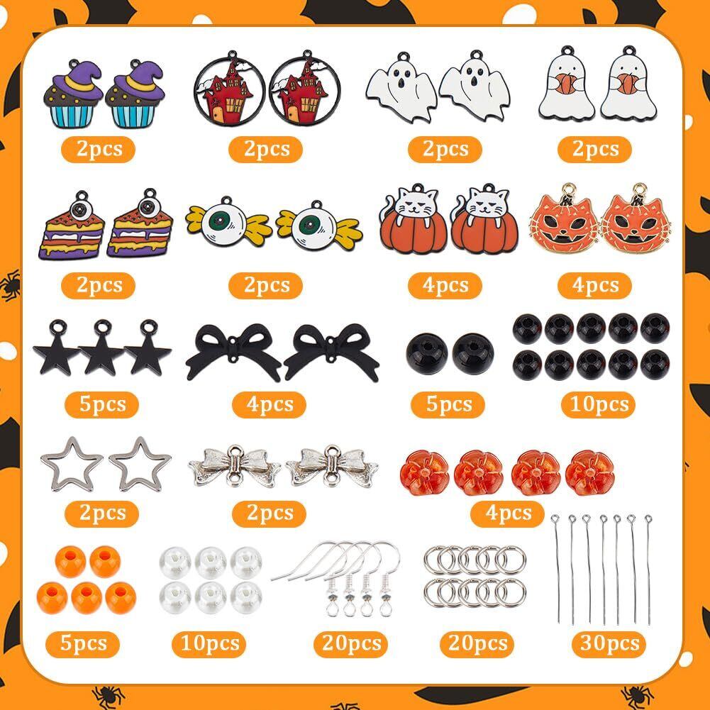 イヤリング作成キット: イヤリングセットには、28つのスタイルのハロウィンチャーム9個が含まれています。 20 スタイルのラウンドビーズ 3 個, 4 個のカボチャビーズ, 10PCSガラスパールビーズ, 6 スタイルのちょう結びリンク 2 個, 2 個のスターリンクリング, 20個オープンジャンプリング, 20 個の耳ワイヤー, 30本のアイピン, プラスチックビーズ容器: 1個.