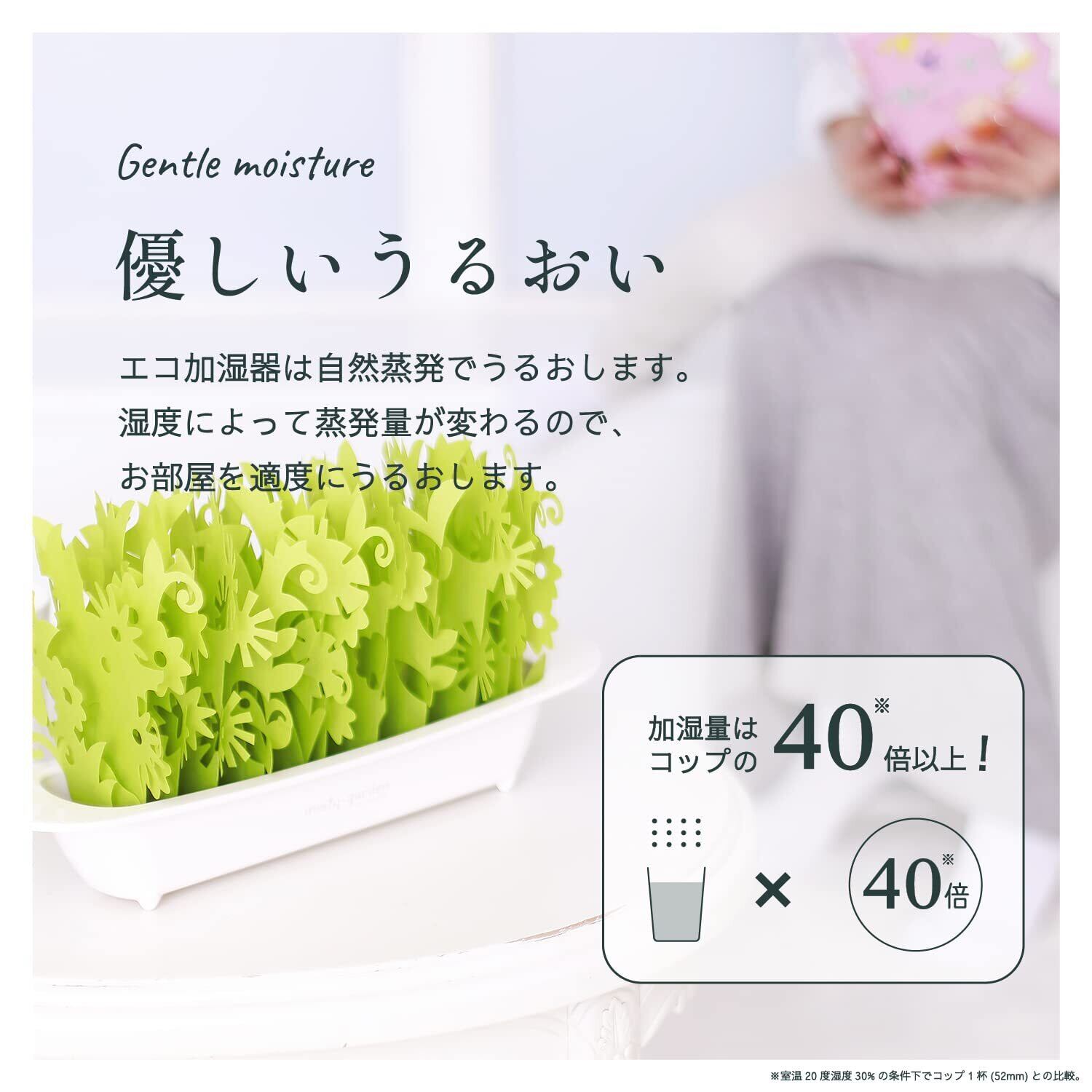 容器が400ccから500ccへ加湿量も30倍から40倍にミスティガーデンが2ndとしてリニューアルしました。容器に水を注ぐだけの電気を使用しない自然気化式のエコ加湿器。オフィスやリビング、寝室などで専用のアロマウォーターを使用すれば、香りも楽しめリラックス・消臭(アンモニア・酢酸)の効果もあります。抗菌・防カビのフィルターを使用。加湿量(=自然蒸発量)はコップ1杯の自然蒸発量の40倍以上!※室温20度湿度30%の条件下でコップ1杯(52mm)との比較。フィルター交換は1シーズン(3~6ヵ月)が目安となります。交換フィルターは が適合します。ミニボトルにはフローラルでリラックスできる瑞々しい香の雫リラックスハーブが入っております。