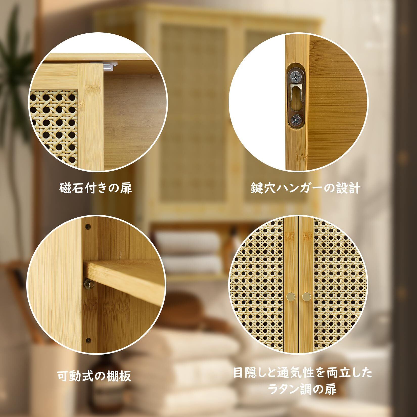 【頑丈で安定性が高い】太い竹材で作られたキャビネットで、棚1段あたりは2.5kg/5kgまでの重さに耐えられ、重い洗剤や柔軟剤を置いても安定感があります。付属のネジとアンカーで固定するタイプなので、壁にしっかりと固定できます。また、扉は使いやすいマグネットタイプで、勝手に開きにくいため、落下防止に役立ちます