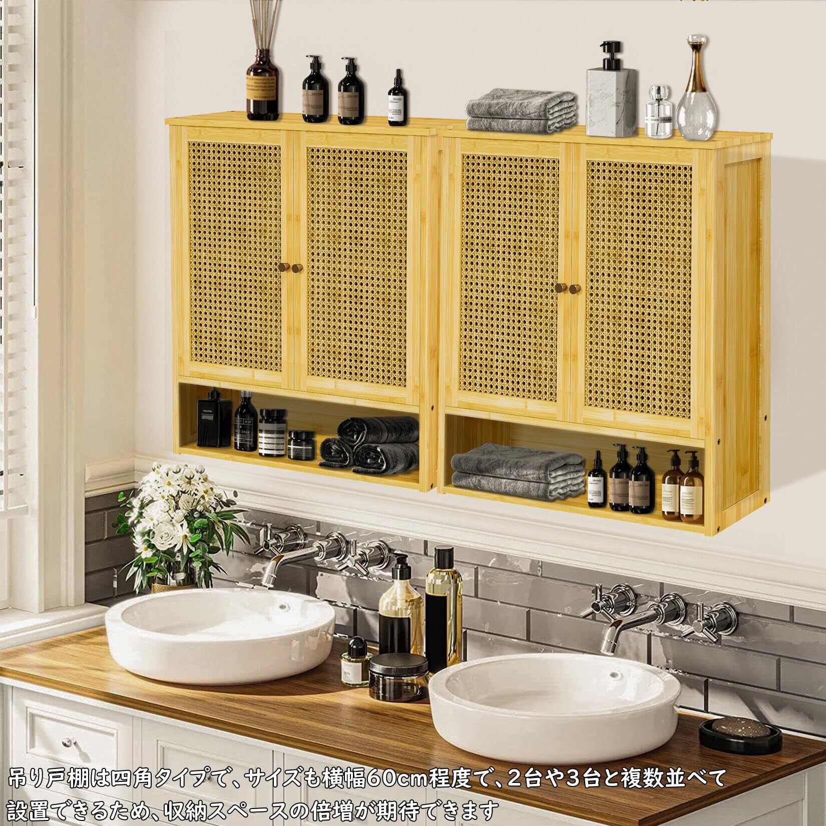 UNHO 吊り戸棚 ラタン調 木製 壁掛けキャビネット 編目 扉付き 奥行き20cm 観音開き トイレ ウォールシェルフ キッチン 後付け 壁面収納 薄型 幅60cm 北欧 リビング 玄関 洗面所 ネジ止め 地震対策