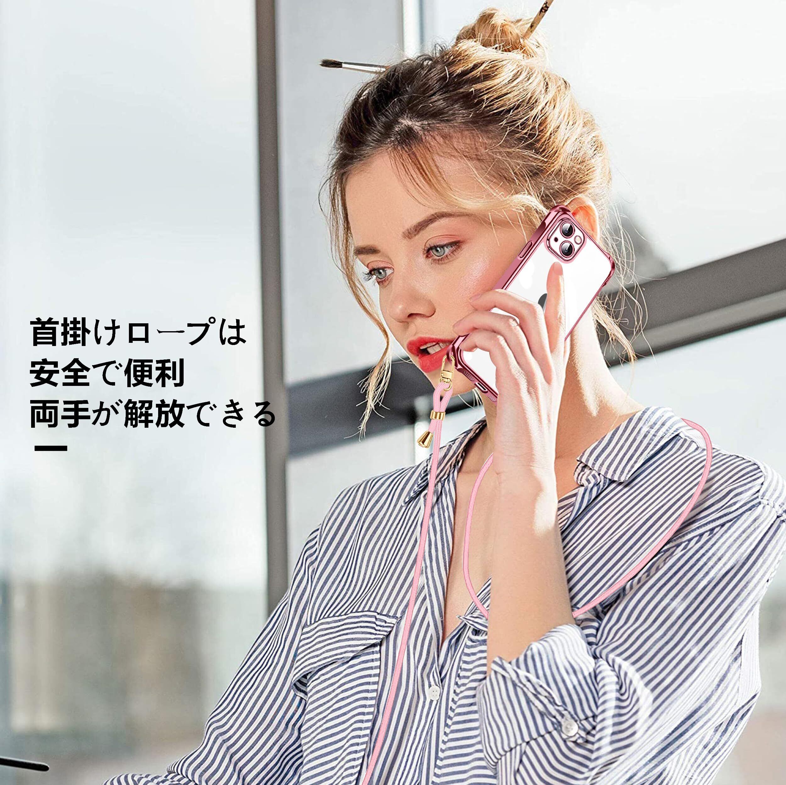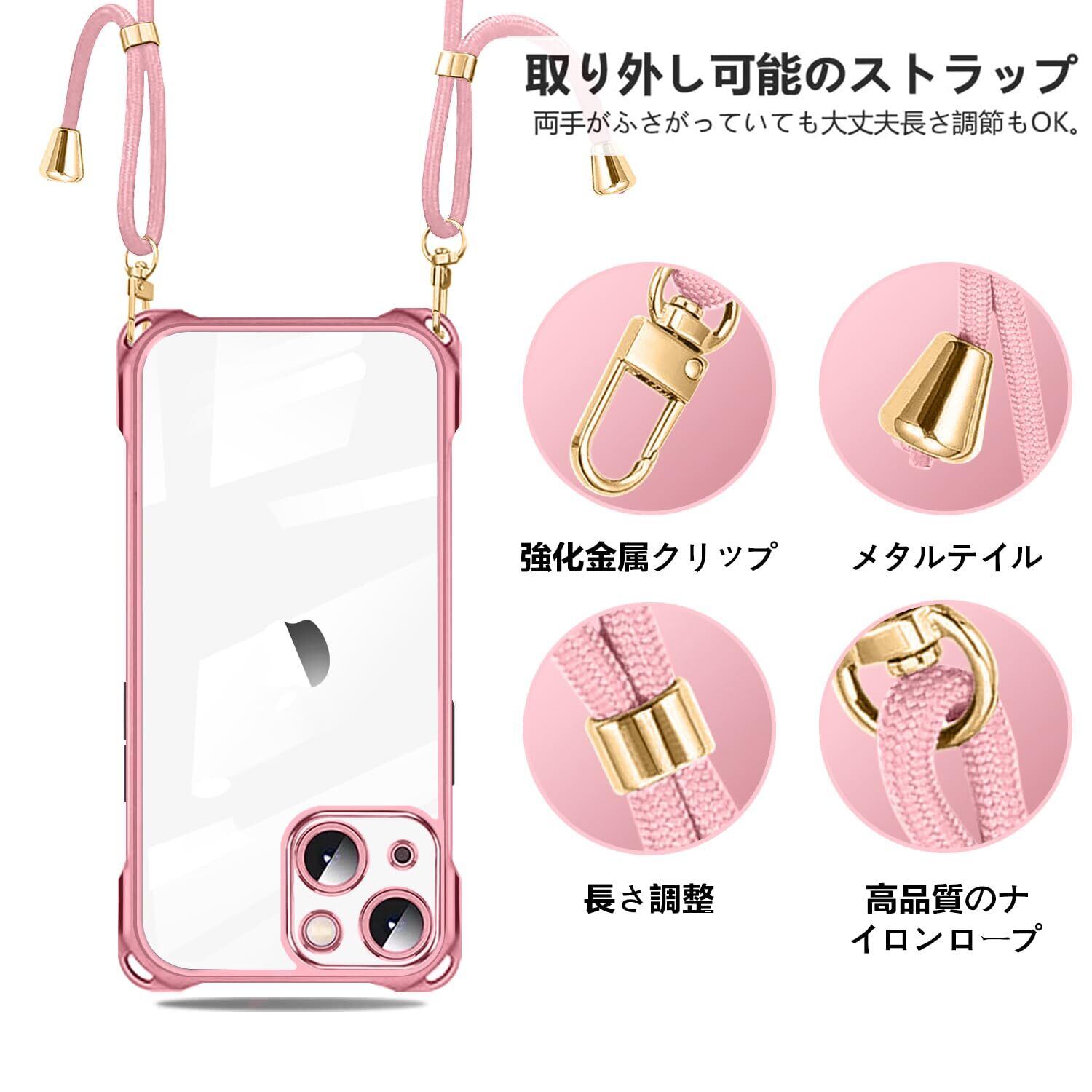 iPhone 15 用 ケース クリア ショルダー iPhone15 用 スマホケース アイフォン15 カバー 肩掛け 斜めかけ 縄掛けケース 透明 薄型 軽量 TPU 携帯ケース 紐付き 斜めがけ 織りストラップ付き ネックストラップ ショルダー ケース 縦/横 2WAY 長さ調整可能 取り外し可能 落下防止 紛失防止 ワイヤレス充電対応 (ローズゴールド)