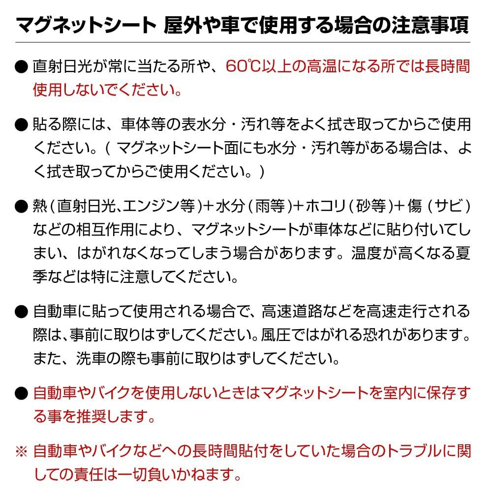 【マグネットシート 屋外や車で使用する場合の注意事項】■直射日光が常に当たる所や、60℃以上の高温になる所では長時間使用しないでください。 ■貼る際には、車体等の表水分・汚れ等をよく拭き取ってからご使用ください。(マグネットシート面にも水分・汚れ等がある場合は、よく拭き取ってからご使用ください。) ■熱(直射日光、エンジン等)+水分(雨等)+ホコリ(砂等)+傷 (サビ)などの相互作用により、マグネットシートが車体などに貼り付いてしまい、はがれなくなってしまう場合があります。温度が高くなる夏季などは特に注意してください。 ■自動車に貼って使用される場合で、 高速道路などを高速走行される際は、事前に取りはずしてください。風圧ではがれる恐れがあります。また、洗車の際も事前に取りはずしてください。 ■自動車やバイクを使用しないときはマグネットシートを室内に保存する事を推奨します。※自動車やバイクなどへの長時間貼付をしていた場合のトラブルに関しての責任は一切負いかねます。